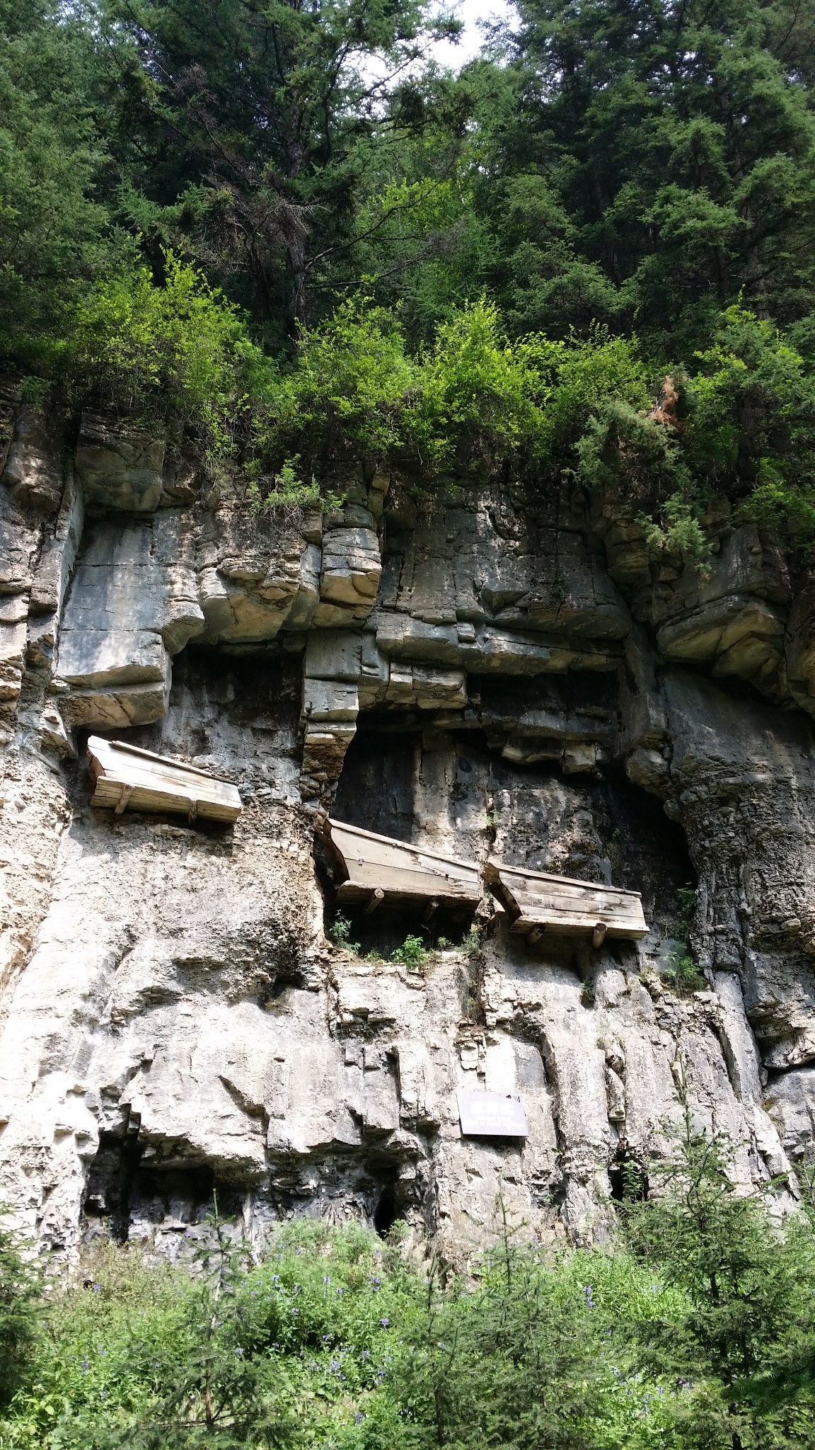 环顾石门内的石壁,并非危岩高耸,而仅有10至20多米之高,皆上下陡峭平滑,壁顶覆盖着绿树灌丛,石壁上悬挂的木棺,有嵌在岩洞里的,也有露在石壁外的,有用木桩支撑,也有用铁链吊捆的,距地面高度不一,但皆能看得非常清晰,目前发现有11具。