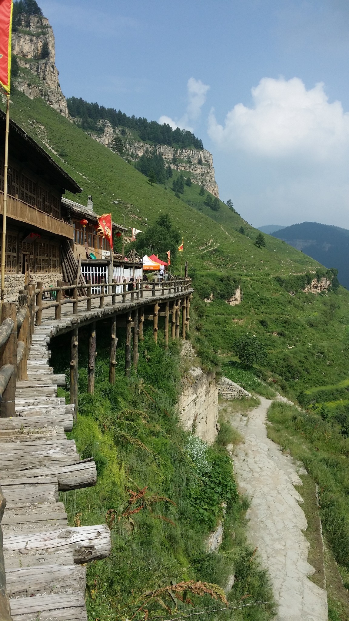 出得冰洞,带着对大自然奇迹的惊叹前往悬崖栈道。悬崖栈道是一条古栈道,险峻程度不逊色于剑门蜀道,长度为21公里,隐藏在苍茫的晋西北黄土高原上。