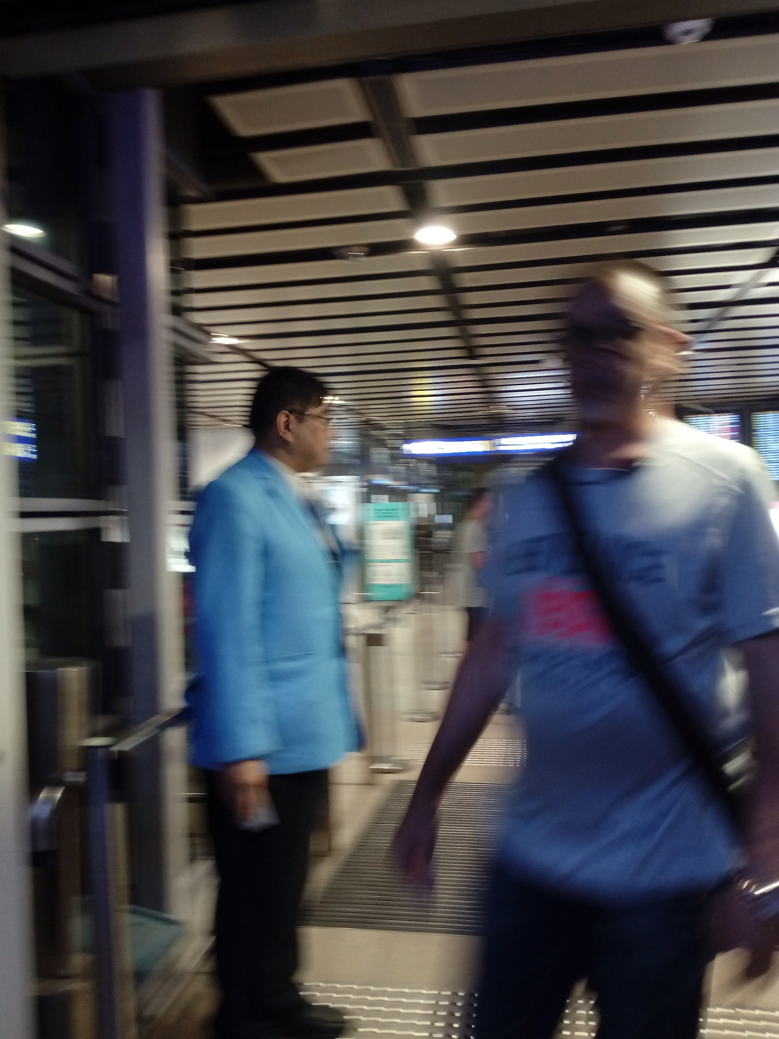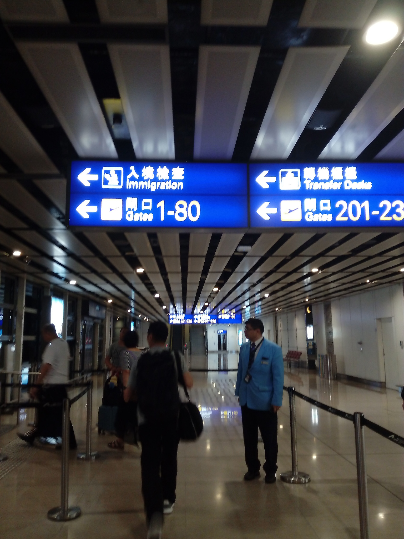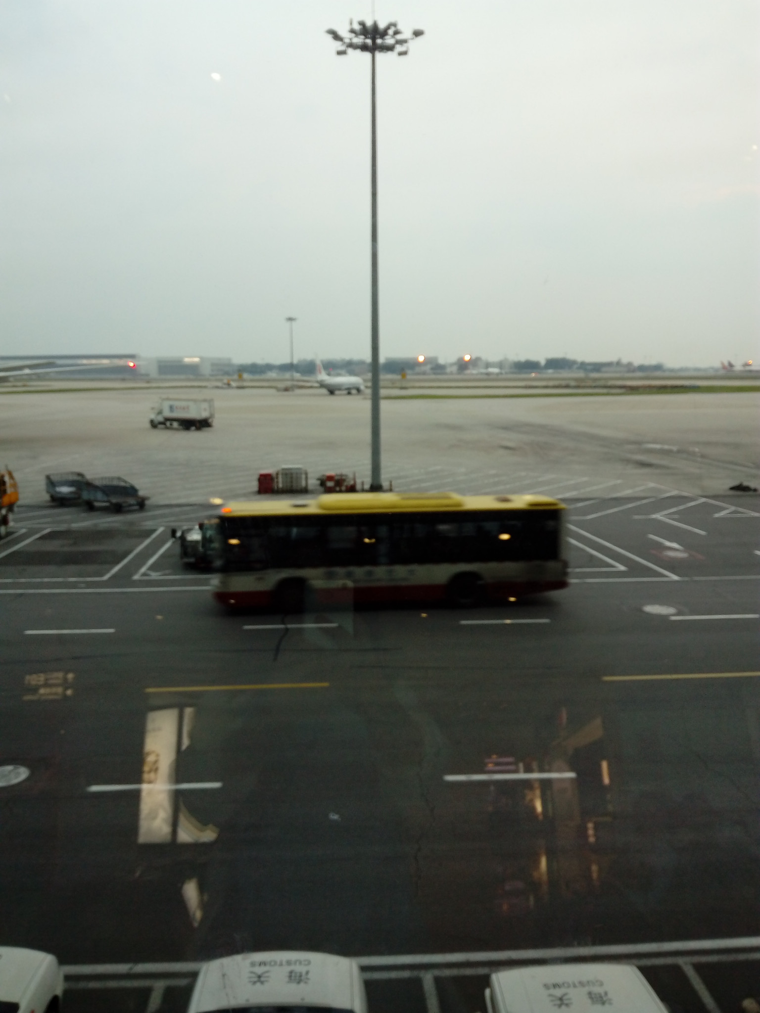 脚步匆匆的过境人士,和机场摆渡车服务人员