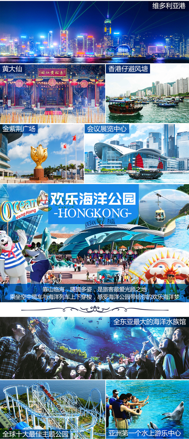黄大仙,浅水湾,海洋公园,太平山,紫金花广场,维多利亚港;更有DFS店铺