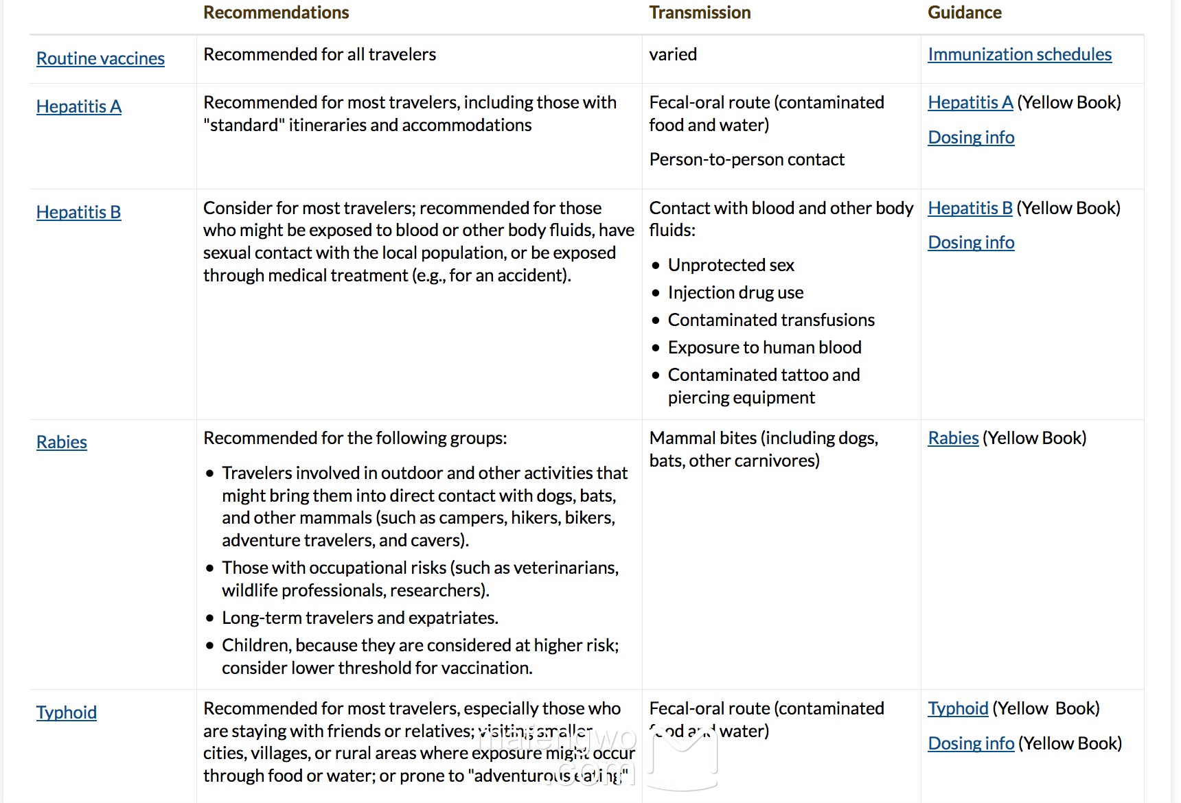 疫苗方面CDC 除各种常规疫苗外还推荐大部分旅行者"most travelers"注射甲肝、伤风疫苗。部分旅行者注射乙肝、狂犬疫苗,根据到古巴的行程、活动不同而因人而异。