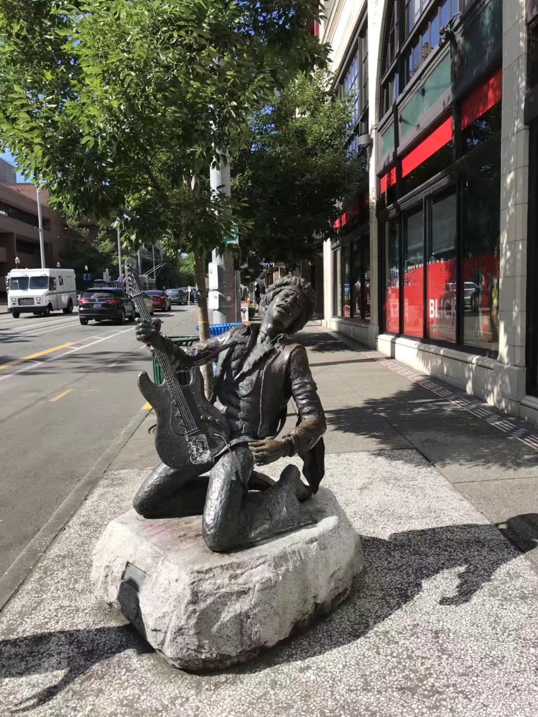 虽然说白天相对安全些,可是路过据说是西雅图抢劫率最高的Cal Anderson Park还是要加紧脚步,匆匆给摇滚乐迷眼里的电吉他之神Jimi Hendrix的雕像拍了张照片,赶紧走人。