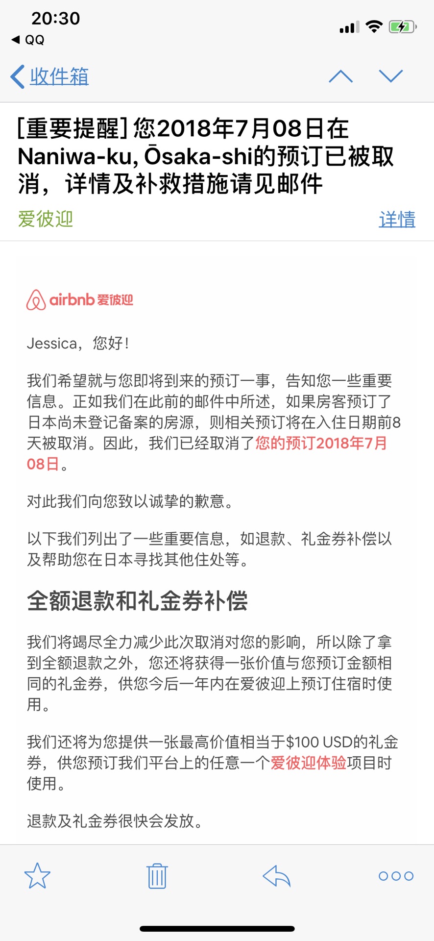 房间还是在airbnb上订的民宿。据说日本出了新政,民宿一定要有合法登记,不然会被取消。出发前一周左右,很不幸预订的大阪名宿被取消了,大清早收到邮件,瞌睡全吓没了,赶快爬起来灰溜溜的重新找房子……airbnb对这次日本调整政策的应对做得还是不错的,取消后全额退款,并且补偿相等价值的抵用券,一年内使用。于是我找了另一家贵一些的,扣掉抵用券算下来人均人民币80/晚,这一换简直让我们捡了个超级大便宜呀!
