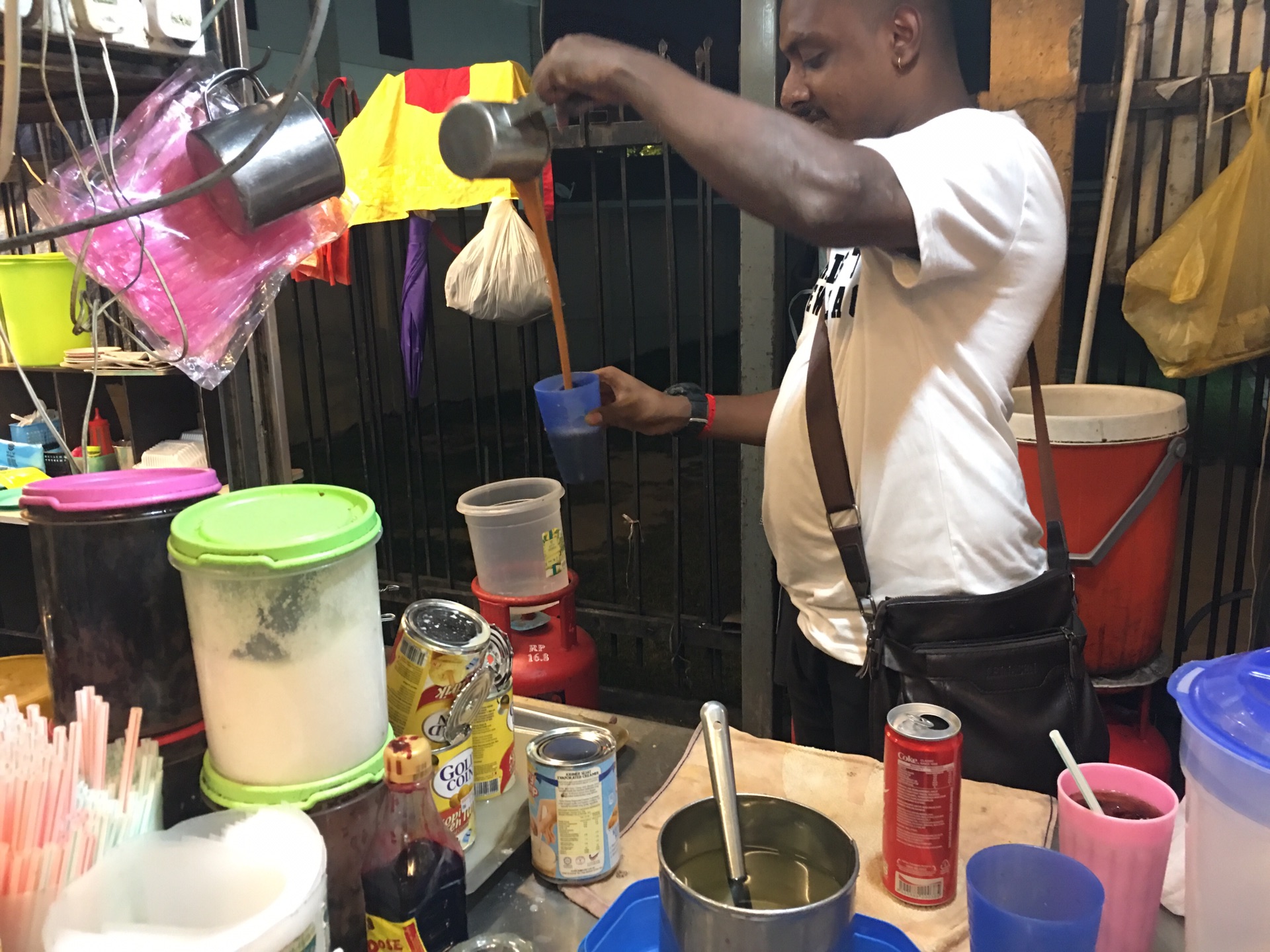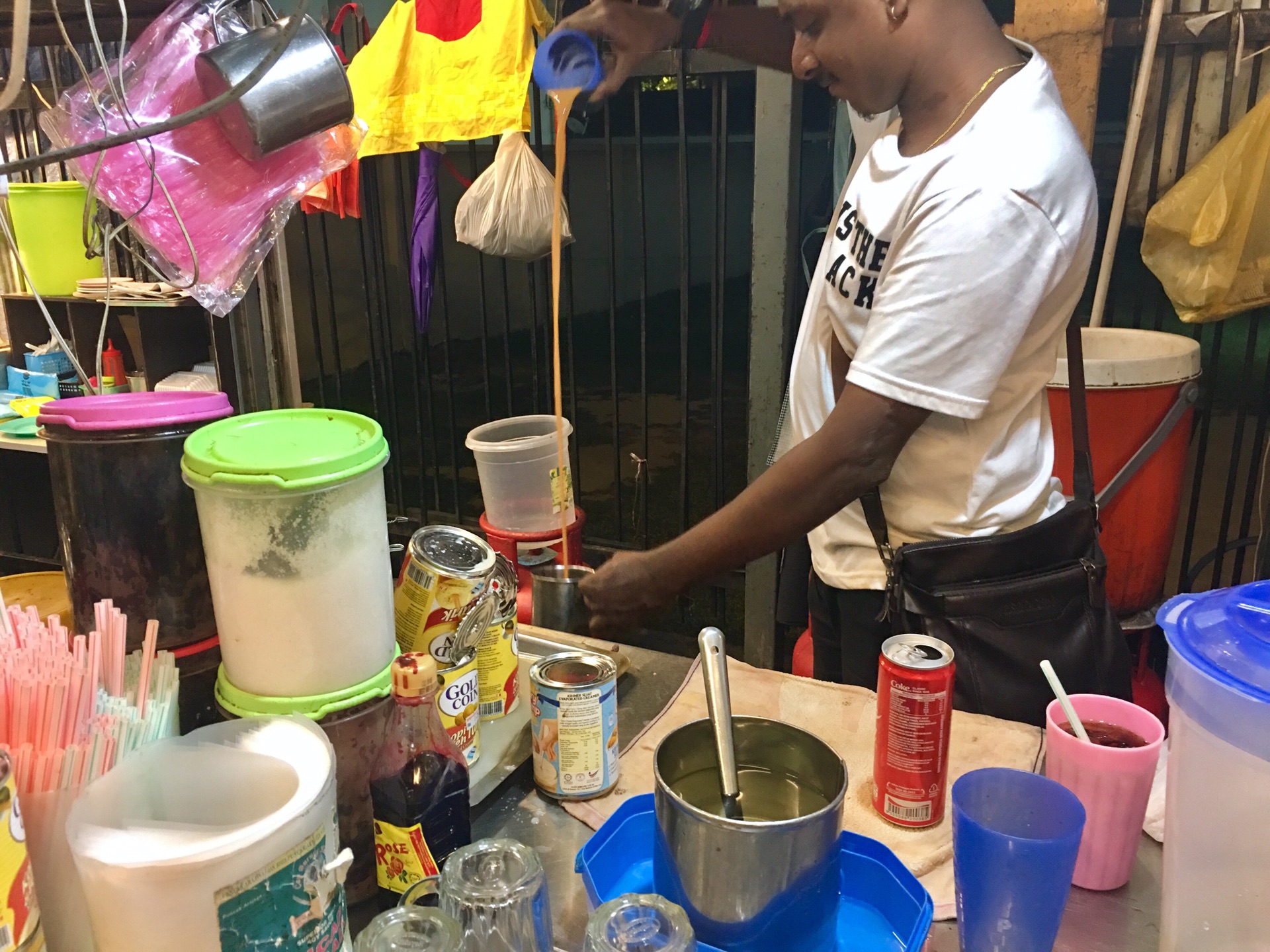 上次在古晋体验了路边摊的美丽,这回想也没想,直奔楼下的小摊。这个小哥发现我在拍照,还特地表演了拉茶哈哈哈