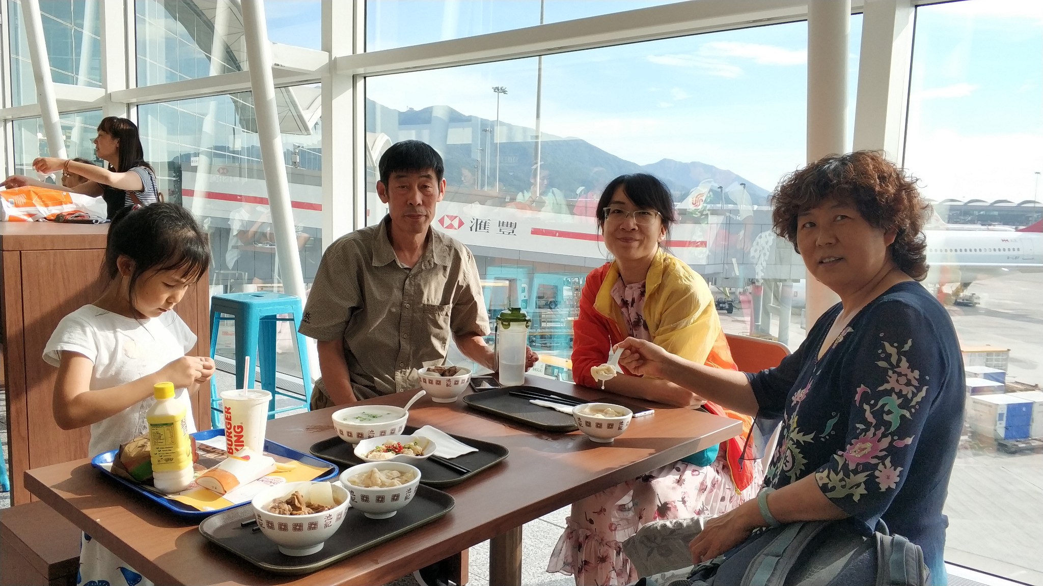 由于飞机延误 航空公司承担每人75港币一份快餐 到各就餐柜台出示登机牌即可点餐