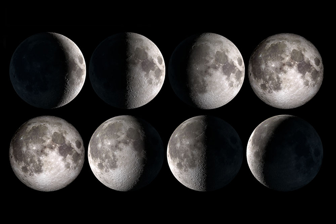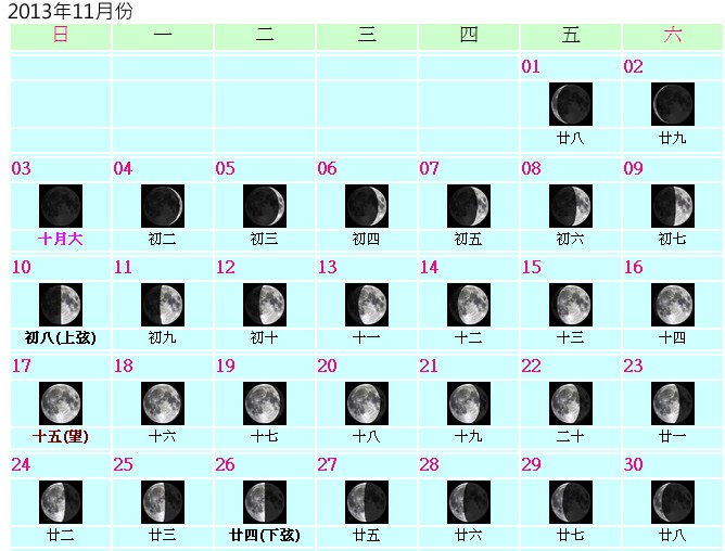 这里有一张月相图,十五的月亮基本是整晚都有,而初一是整晚没有月光。