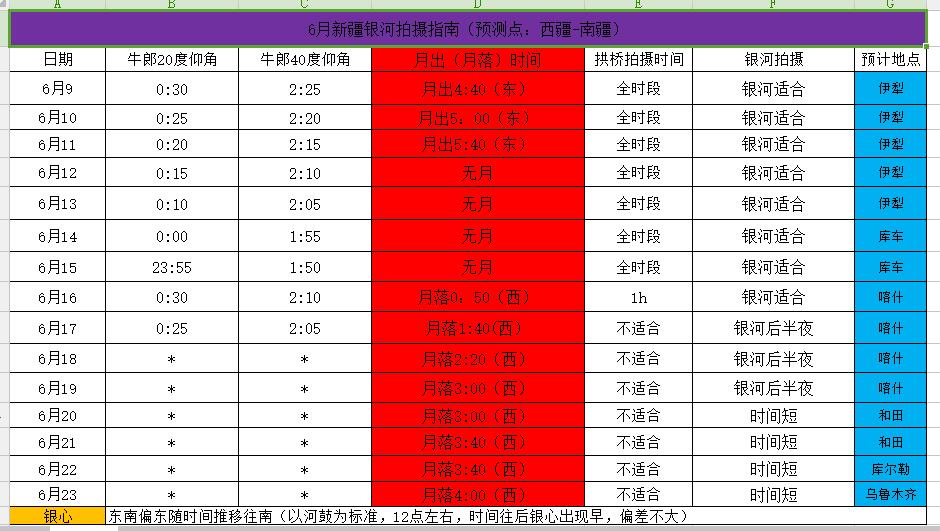 上图为我6月去新疆做的一份银河拍摄计划表。里面我每天的银河出现时间记录好了,当我到达这个地方就可以知道晚上银河什么时间段出现,不需要我在野外傻傻苦等。你如果不会制作计划表,可以简单在纸上写好各个时间段。
