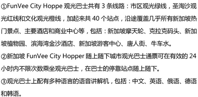 除了市区地铁和公共巴士外,亲们可以尝试一下FunVee双层露天观光巴士,它可以带你穿行于新加坡的主要景点,观赏新加坡美景,体验一种完全不同的新加坡。FunVee双层露天观光巴士涵盖了3条观光线路的30个景点,您可以在24小时内随意上下巴士,途中还会播放景点介绍,让你充分自由探索新加坡的城市、街区、景点。沿着唐人街、甘榜格南和小印度漫步,尽情探索新加坡丰富的种族、文化和历史积淀。宁静优雅的花园、摩登时尚的摩天大楼、现代购物中心,还有矗立在维多利亚剧院之外,令人瞩目的新加坡创始人史丹福莱佛士爵士的青铜像。网上预订通票约人民币80元,还是OPEN票,购买后一个月内任意日期都可以兑换使用。