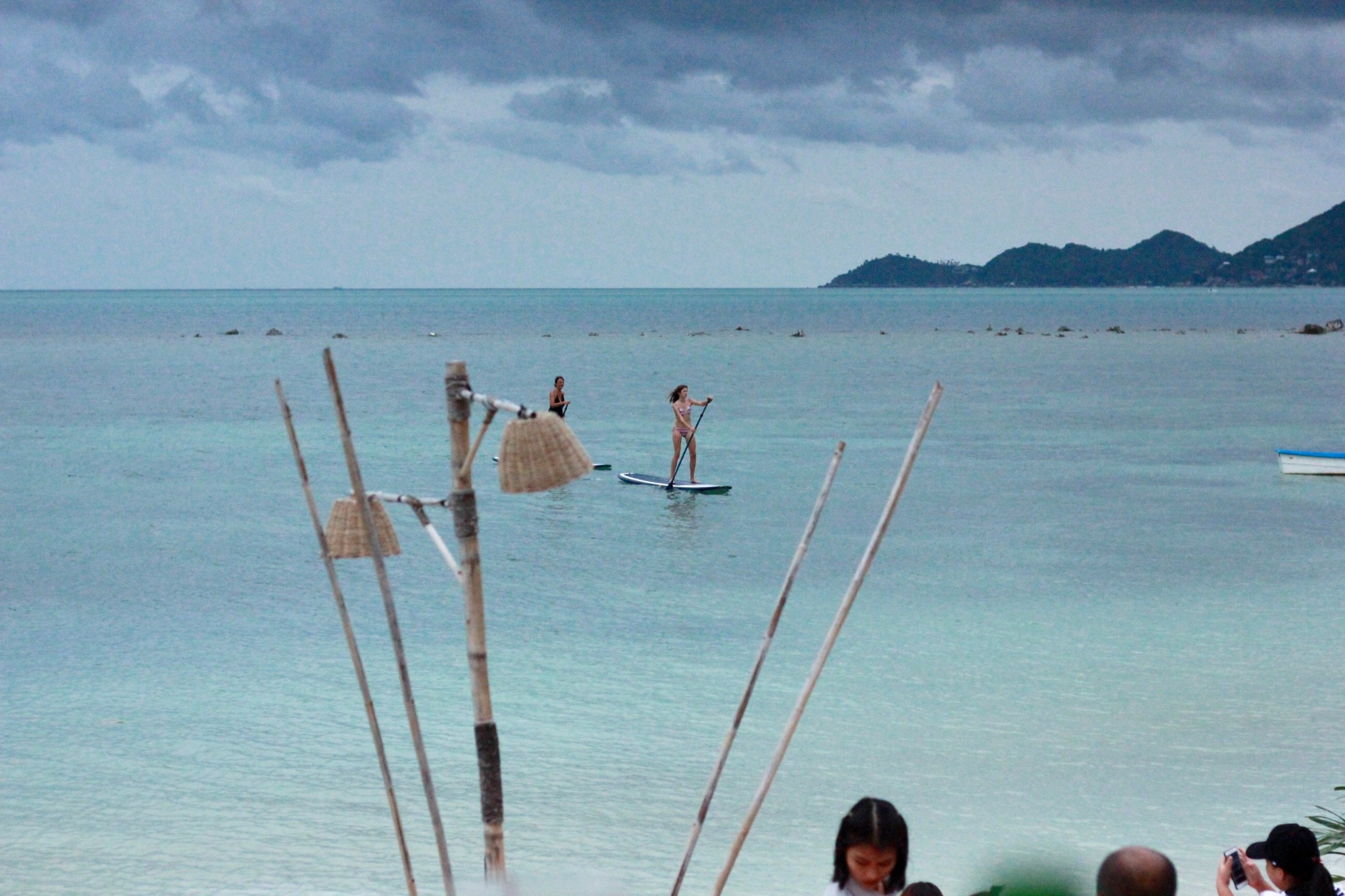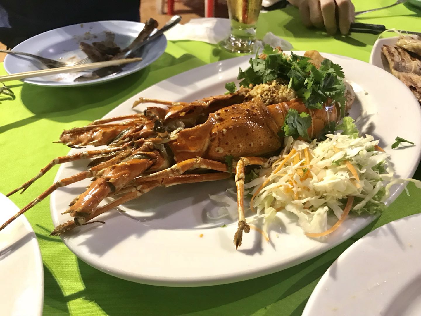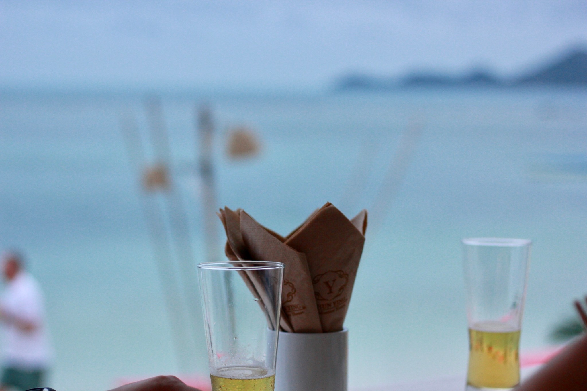 顺着沙滩往海里走,可以看到几十公分长的海参、成群的海胆与海带,还有许许多多的小螃蟹和小海螺。中午在海边一间叫做Montien House的餐厅吃了饭,这家店环境很好,面海一侧都是敞开的,对着一排白色小船,隔了几天我又回来跟J同学划了小船