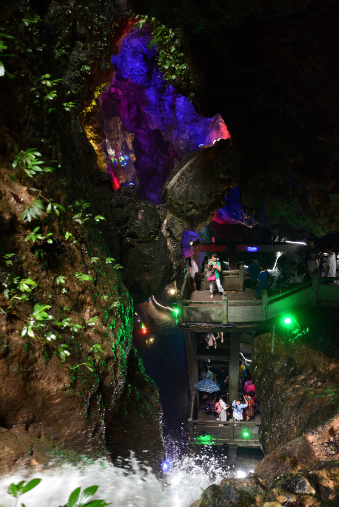 深深的洞底水流潺潺,洞顶呈一线天,洞壁及洞顶布满各种造型奇异的钟乳石。