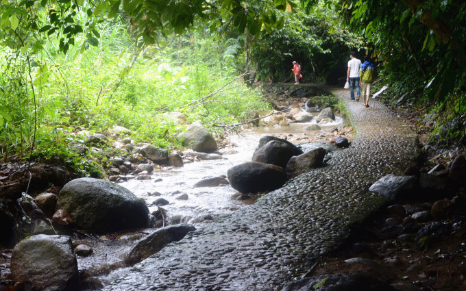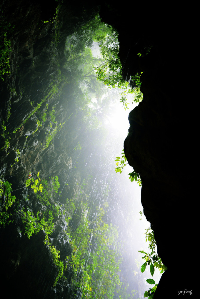 入峡谷的小径从遮 天蔽日的枯藤老树下穿越下坠,宛如一条绿色的隧道通往地心。