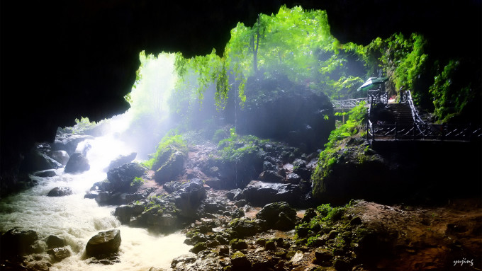溶洞深邃曲回,沿石壁云梯往上攀越约30米高时,一条洞中暗流迎面而来,循石壁而下,形成多层小瀑布,清澈透明。