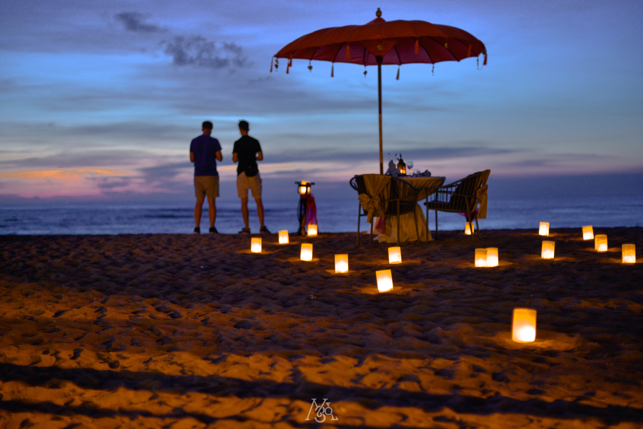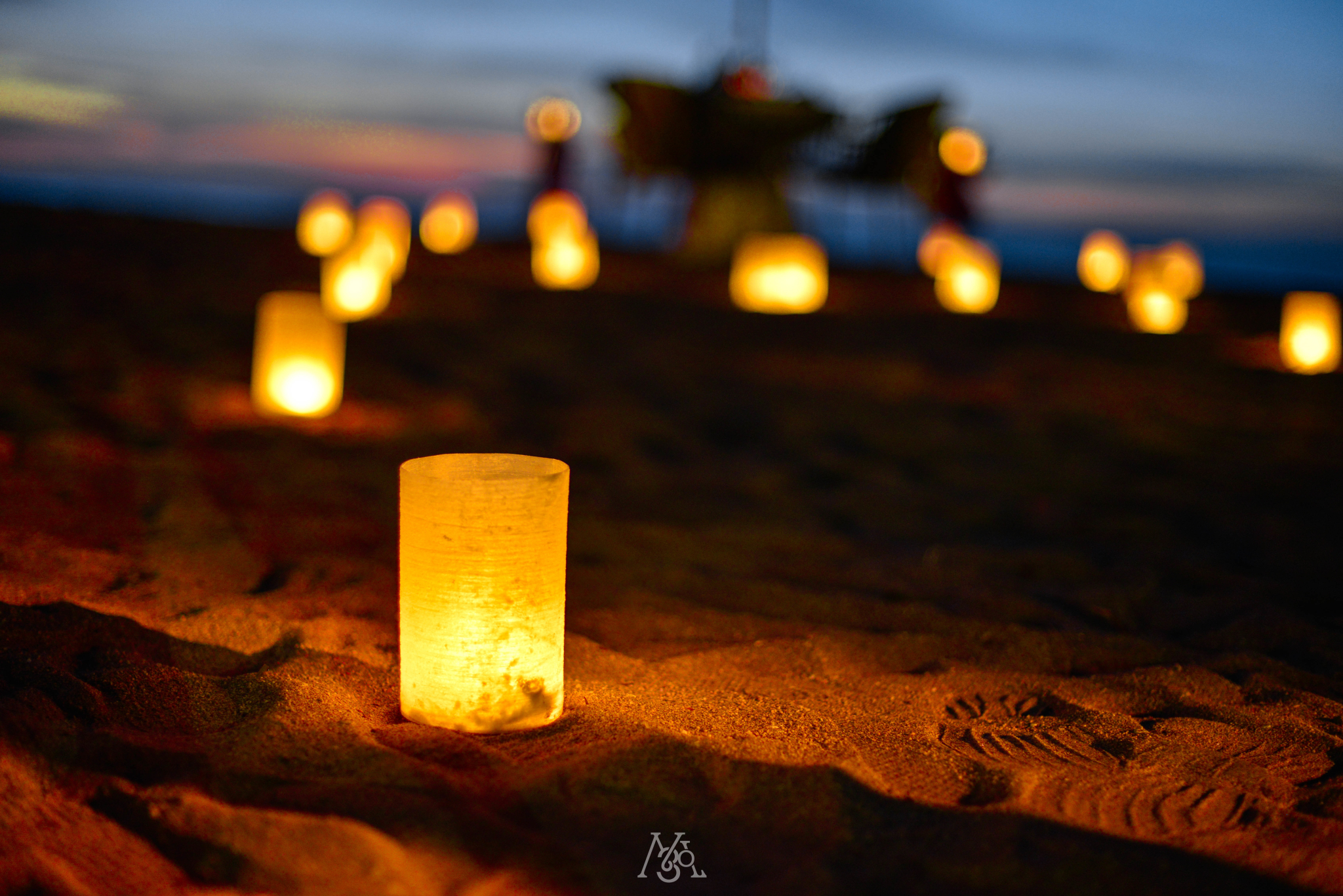 日落下的海岛沙滩,被大光圈虚化的点点烛光,满满都是爱意。