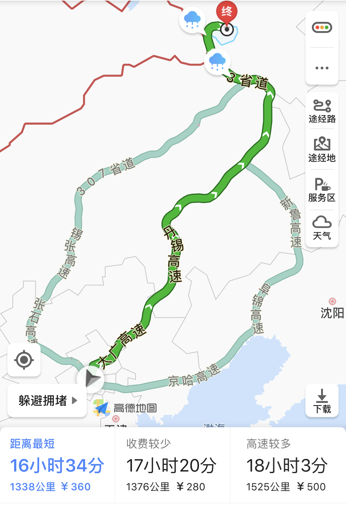 从北京前往阿尔山的路线就是上图这样的,大广高速,丹锡高速,203省道一路下去,即可到达目的地。全程导航显示16个小时,看到这里大家可能并不会有什么想法,但是我想说,从北京走高速过去,就算不开120,全程100迈的速度一直开,1338公里也就13个小时不是么,更何况路上也没什么车,为什么会多出3.4个小时来呢?请看下图: