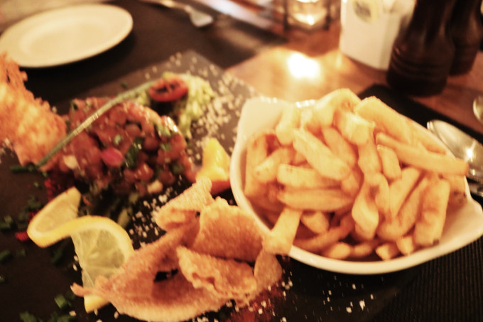 这是我们点的头臺,Red Tuna with Ginger, 这一盘很好吃,不错的开胃小菜,是吞拿鱼鱼块,薯条,还有炸面片组成的,上来后就被我和阿琳吃的干干净净。也许是因为泡完温泉后,消化功能特别好。一开始相机没调好,灯光暗的食物拍出来都是糊的,而且又饿,所以一下头臺图片请见谅。