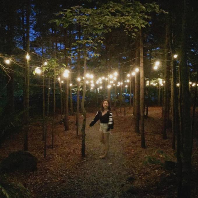 下面为泡完温泉,在外面的小树林里回停车场的路上。拍的有点糊,哈哈哈。