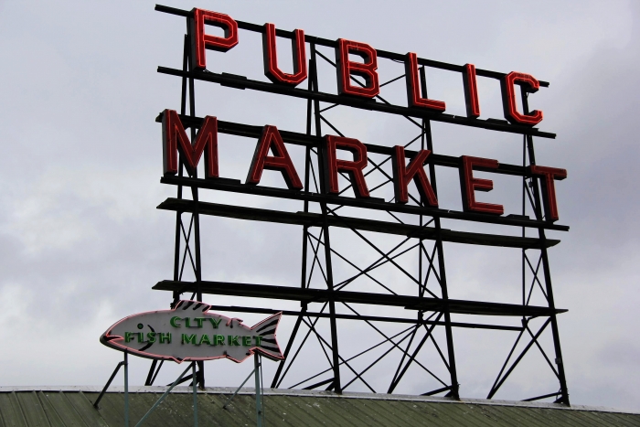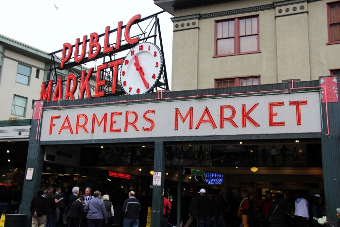 到了市中心之后首先去了派克市场(Pike Market)。该市场位于派克街和佛吉尼亚街上第一大道和西大道之间。始建于1907年,西雅图派克市场的前身是农村集贸市场。如今已发展成一个重要的旅游胜地,每年举办200场商业活动,展出190种手工艺 ,设立120个农产品摊位和形形色色街头表演艺人,以此吸引着来自四面八方的游客。
