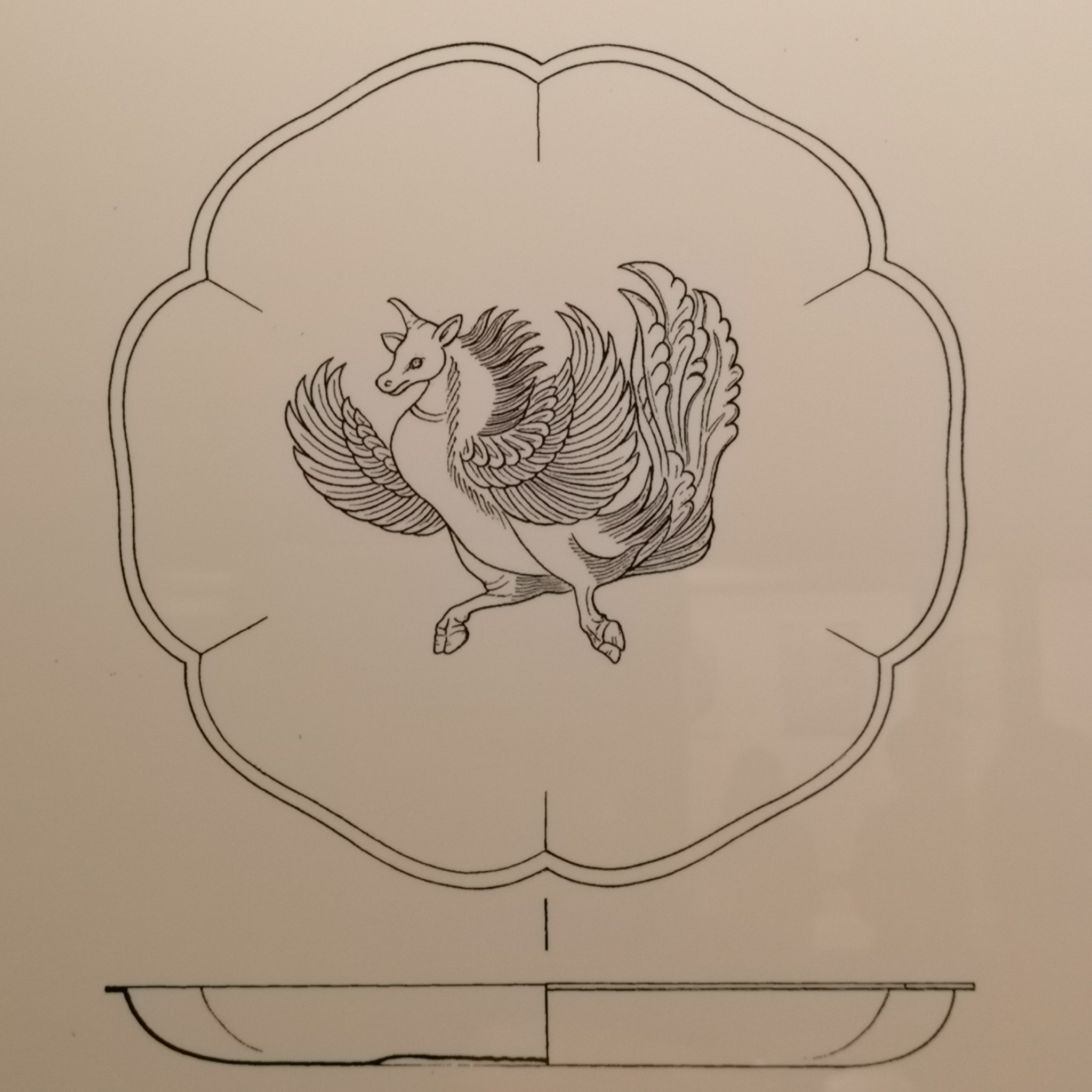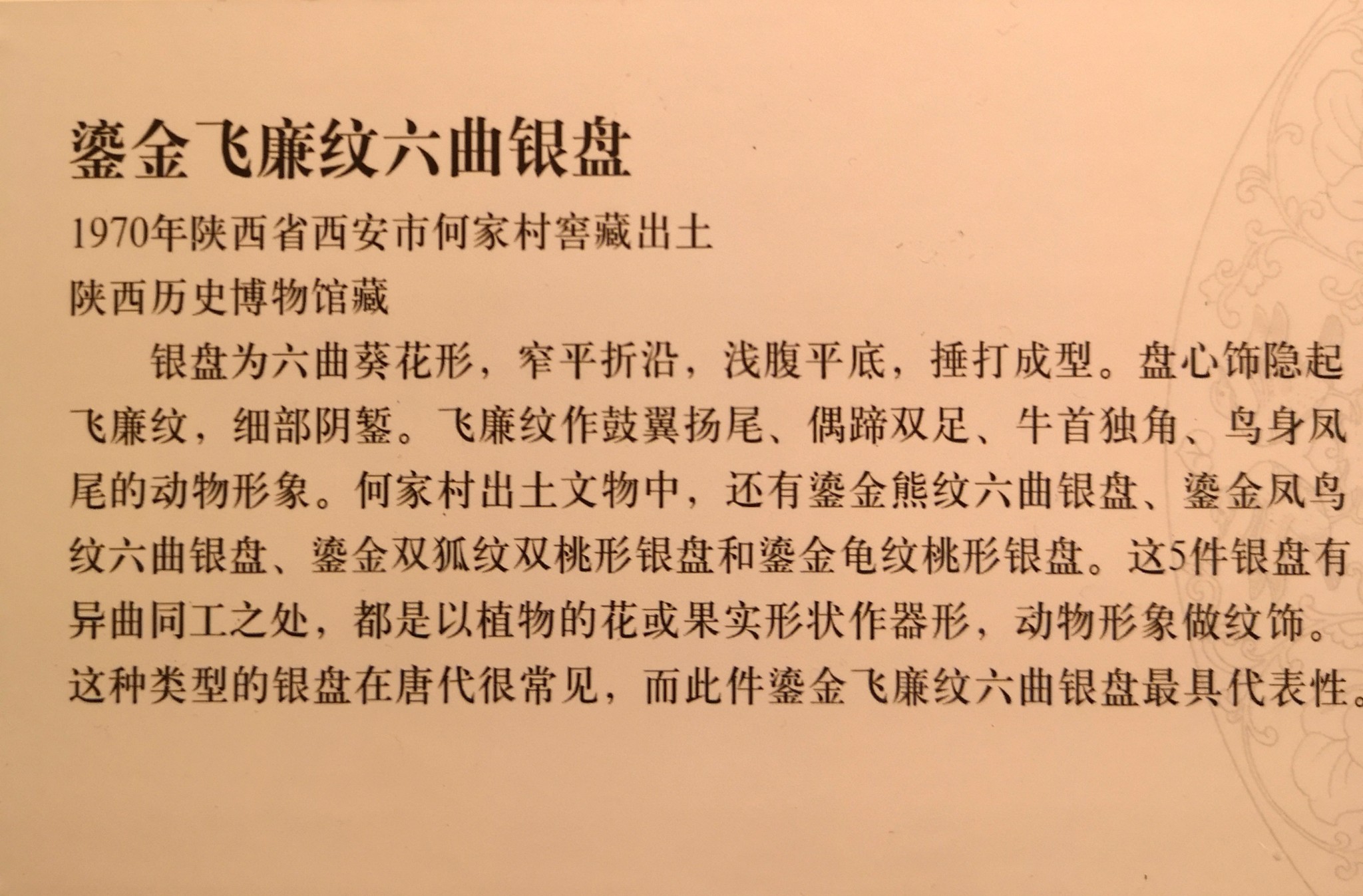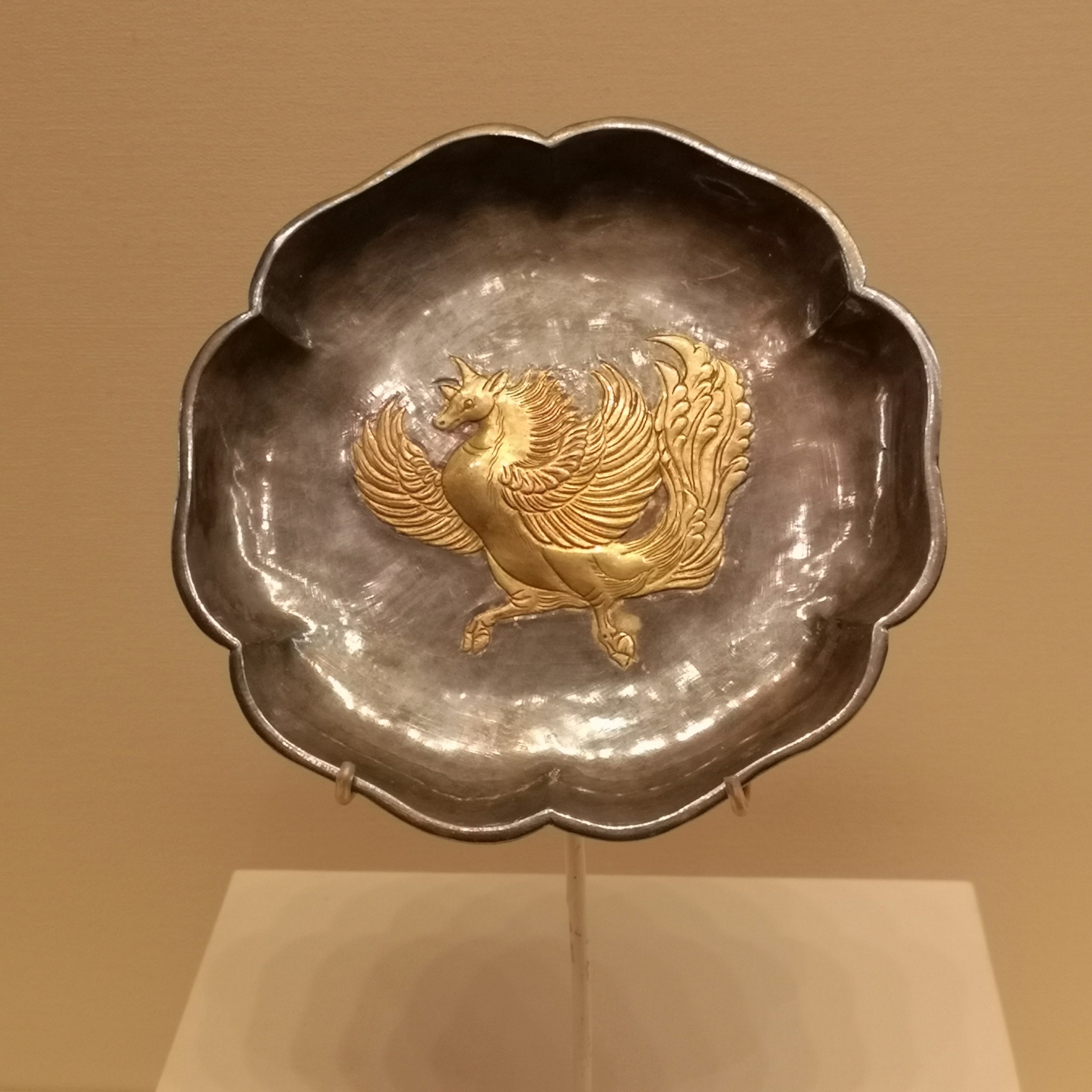 鎏金飞廉纹六曲银盘,1970年陕西省西安市何家村窖藏出土,陕西历史博物馆藏。
