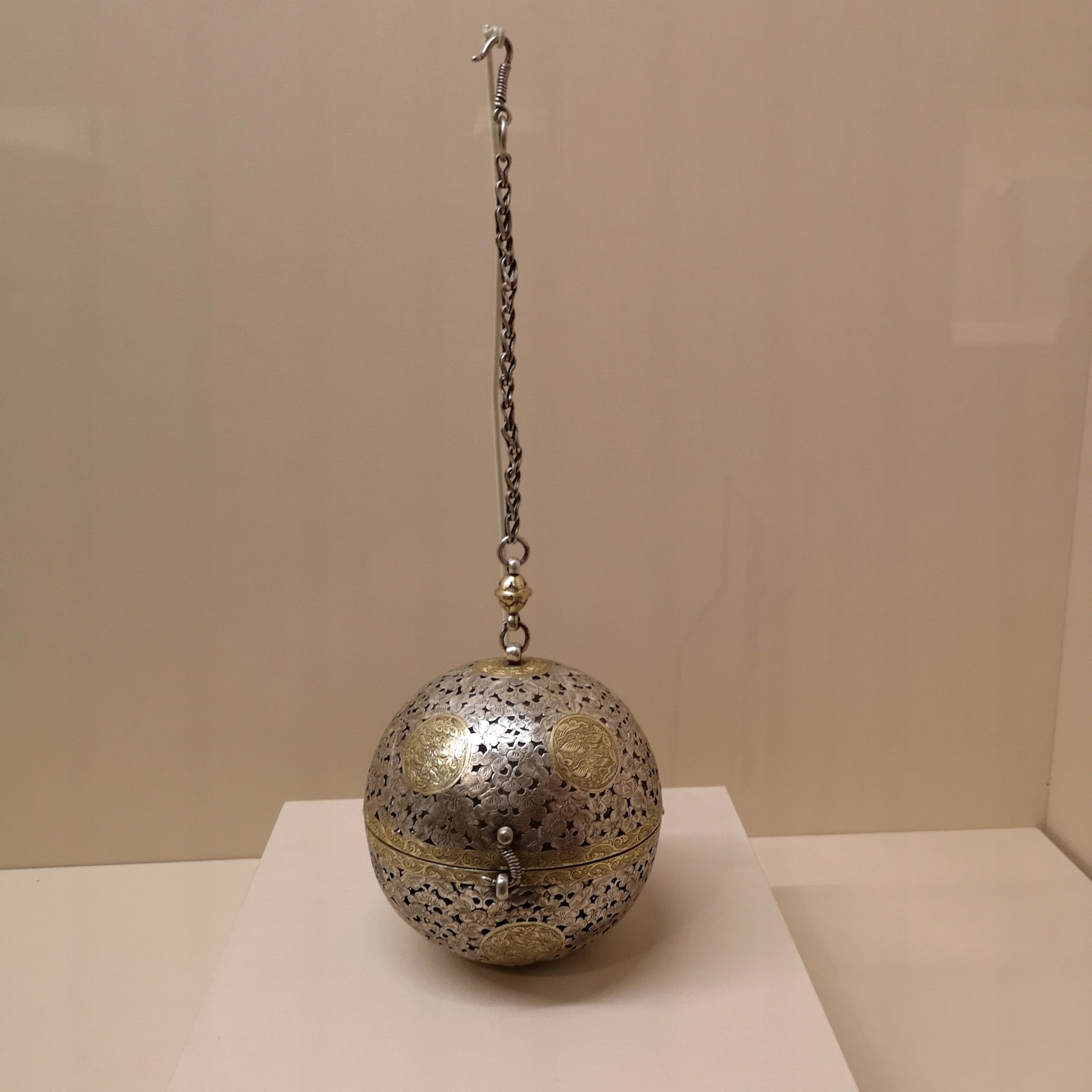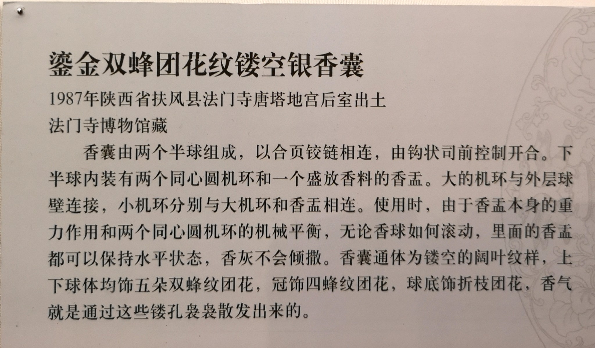 鎏金双蜂团花纹镂空银香囊,1987年陕西省扶风县法门寺唐塔地宫后室出土,法门寺博物馆藏。