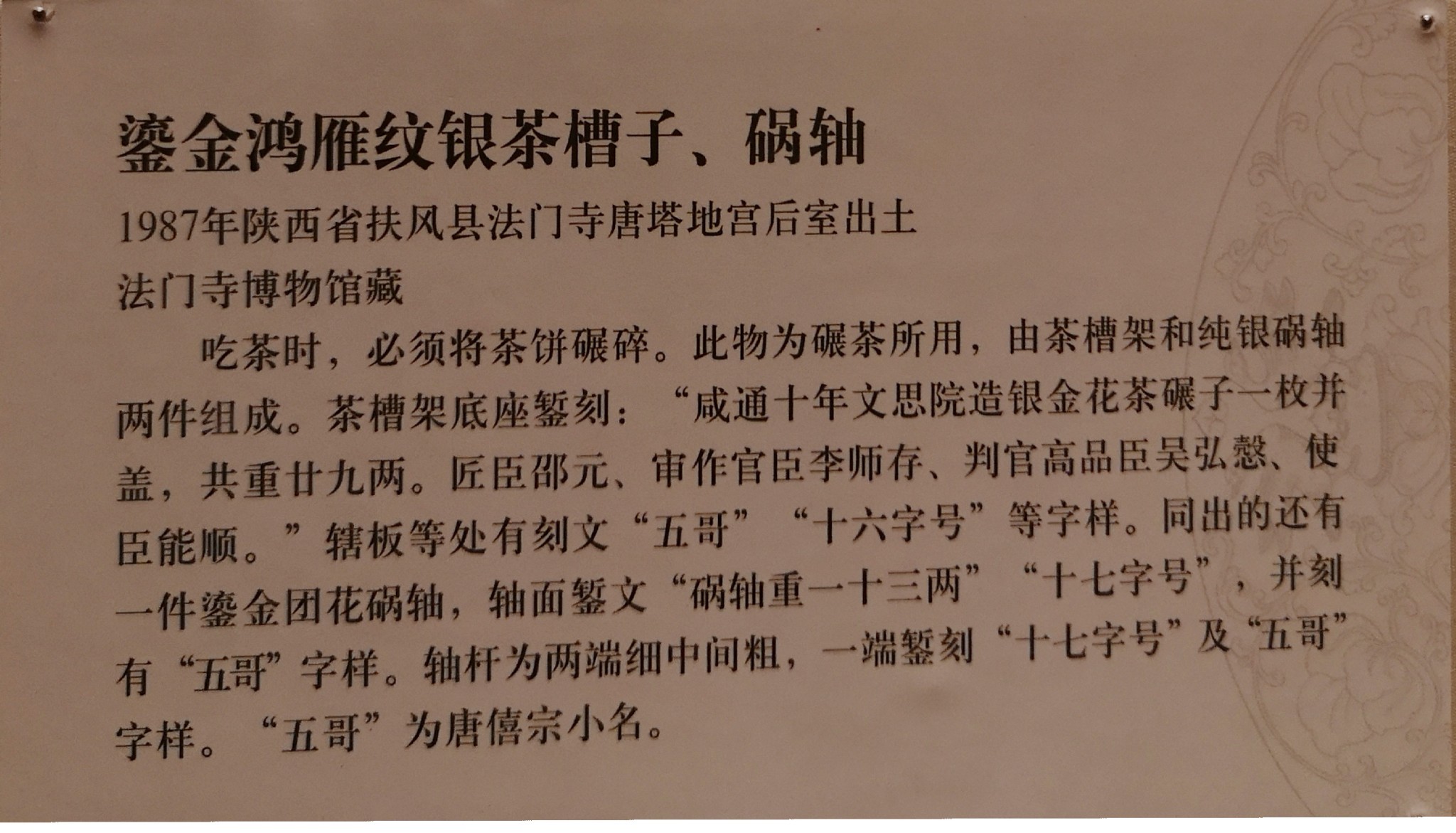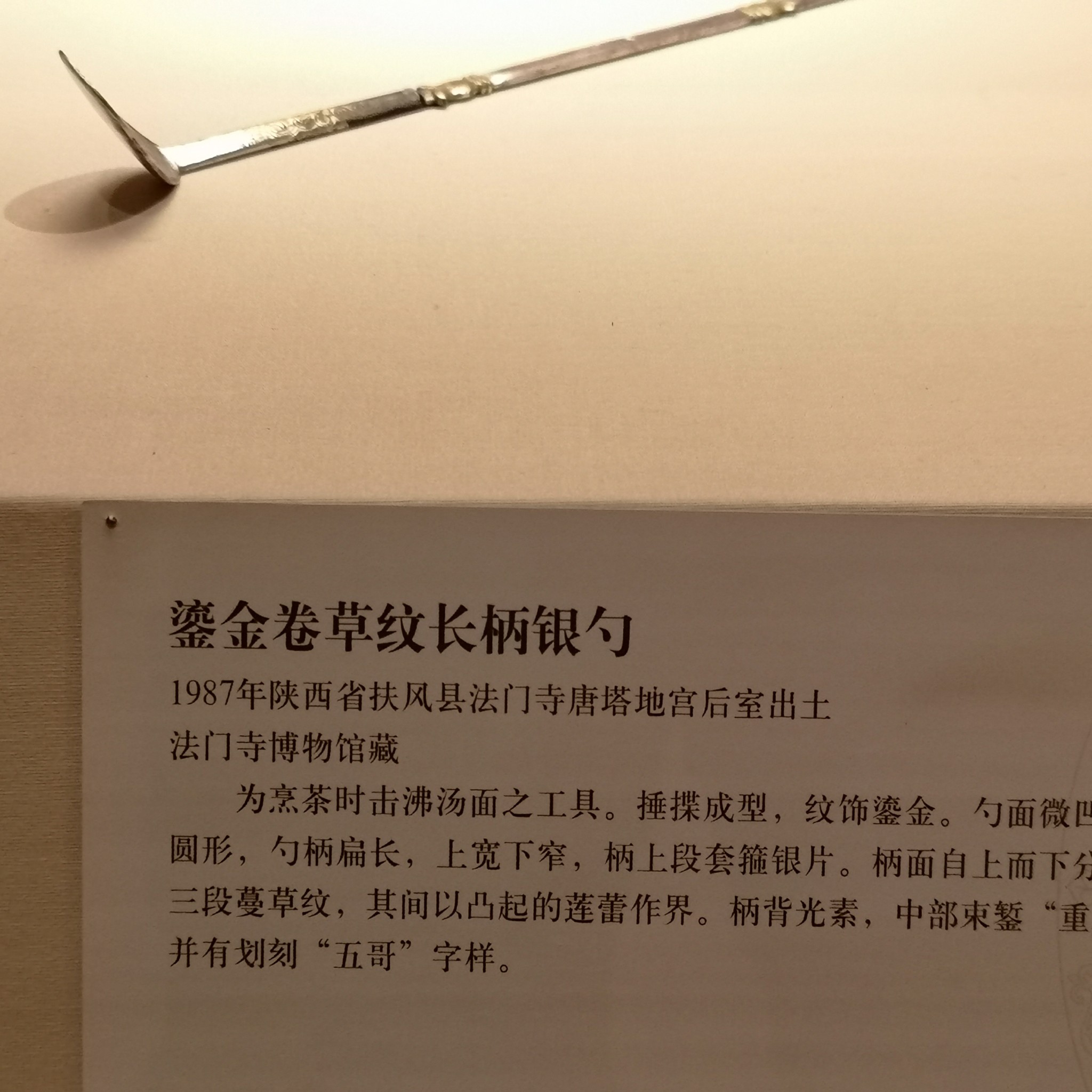 鎏金鸿雁纹银茶槽子、锅轴,1987年陕西省扶风县法门寺唐塔后室出土,法门寺博物馆藏