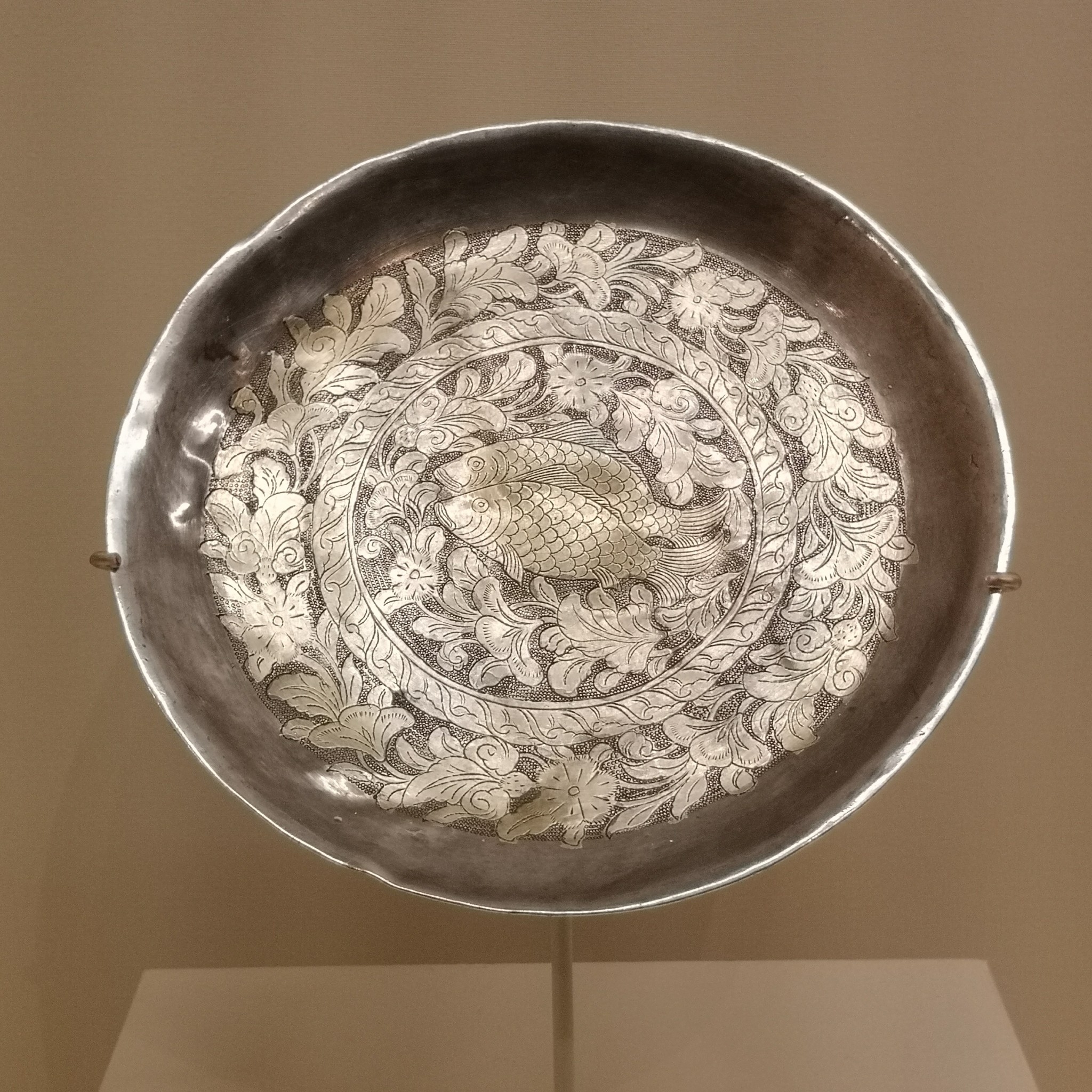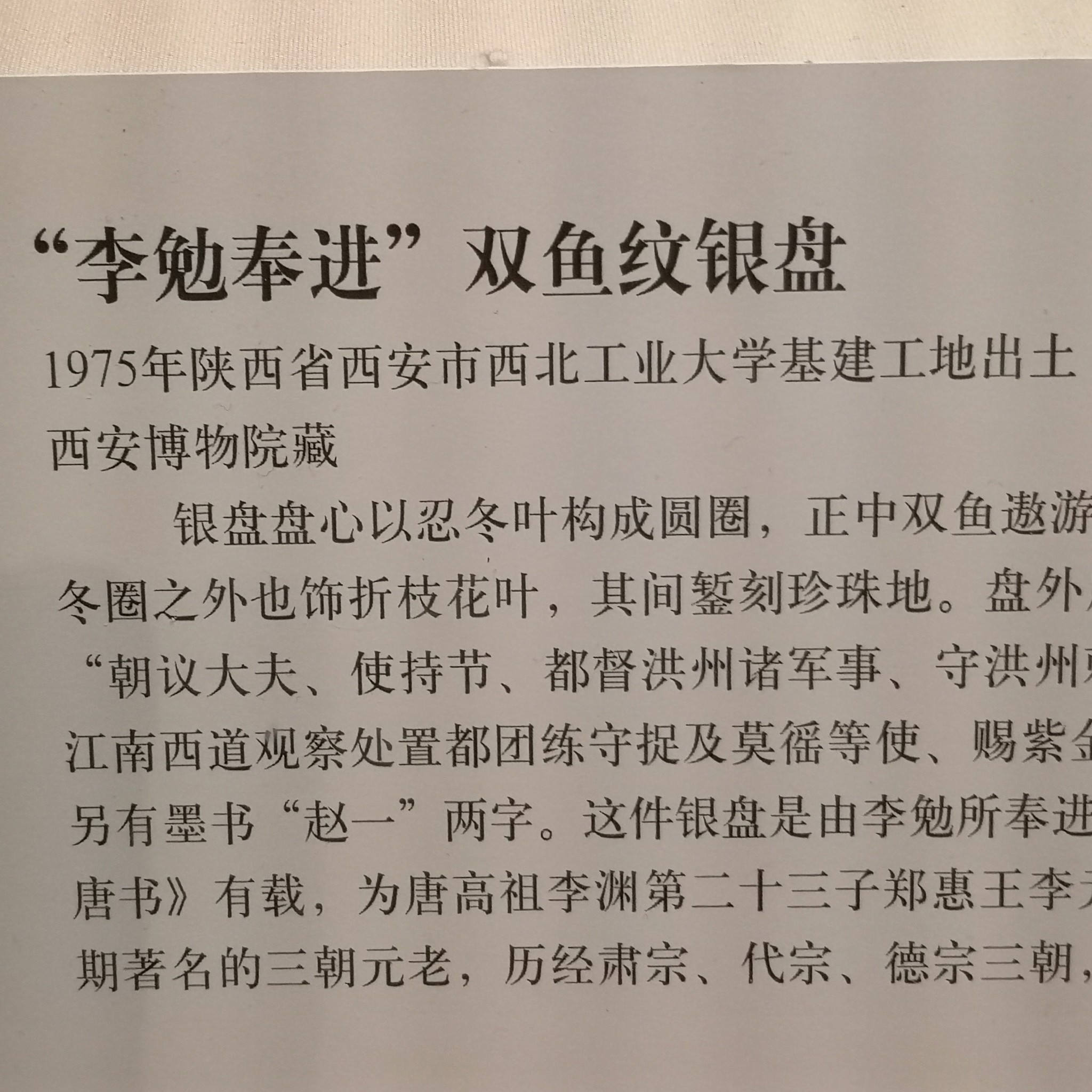 “李勉奉进”双鱼纹银盘,1975年陕西省西安市西北工业大学基建工地出土,西安博物馆藏