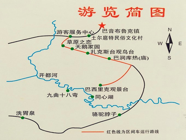 景区观光车停留三站:天鹅家园、巴润库热庙、巴西里克观景台(九曲十八弯),游客中心到巴西里克观景台约45公里;景区不能自驾入内;门票两天内有效