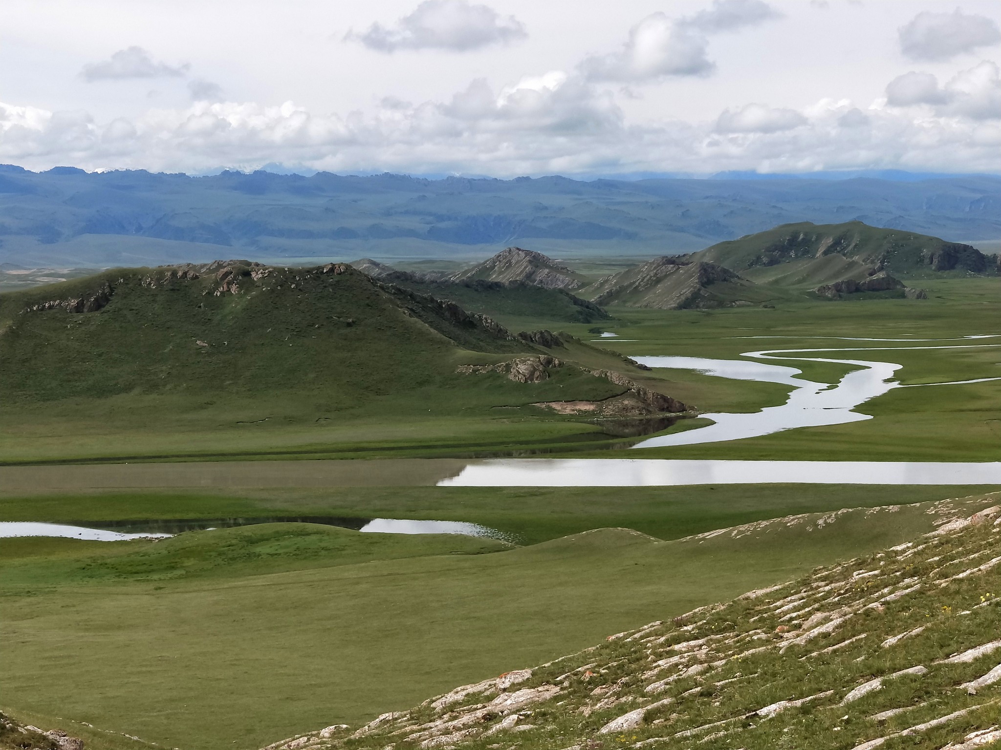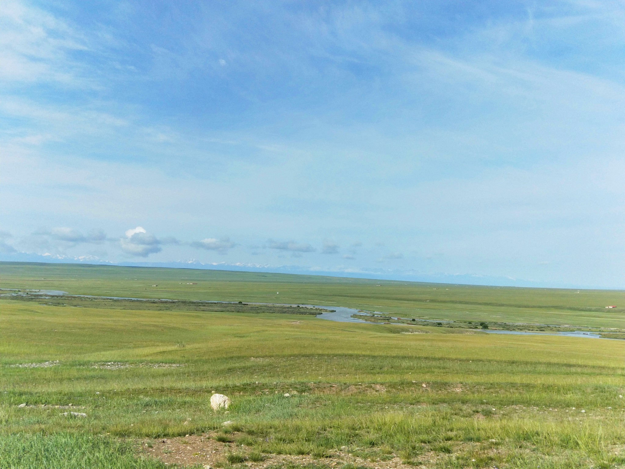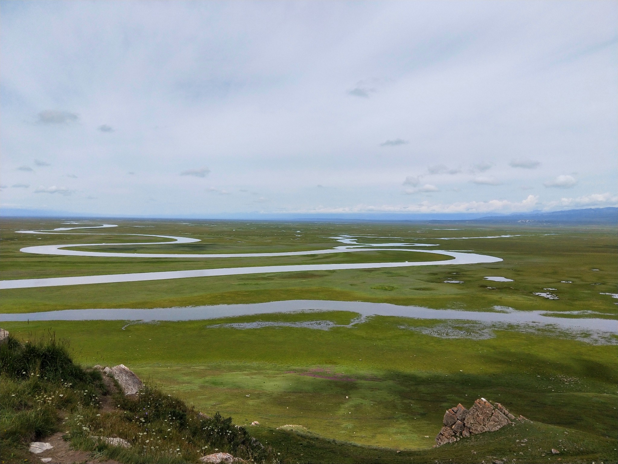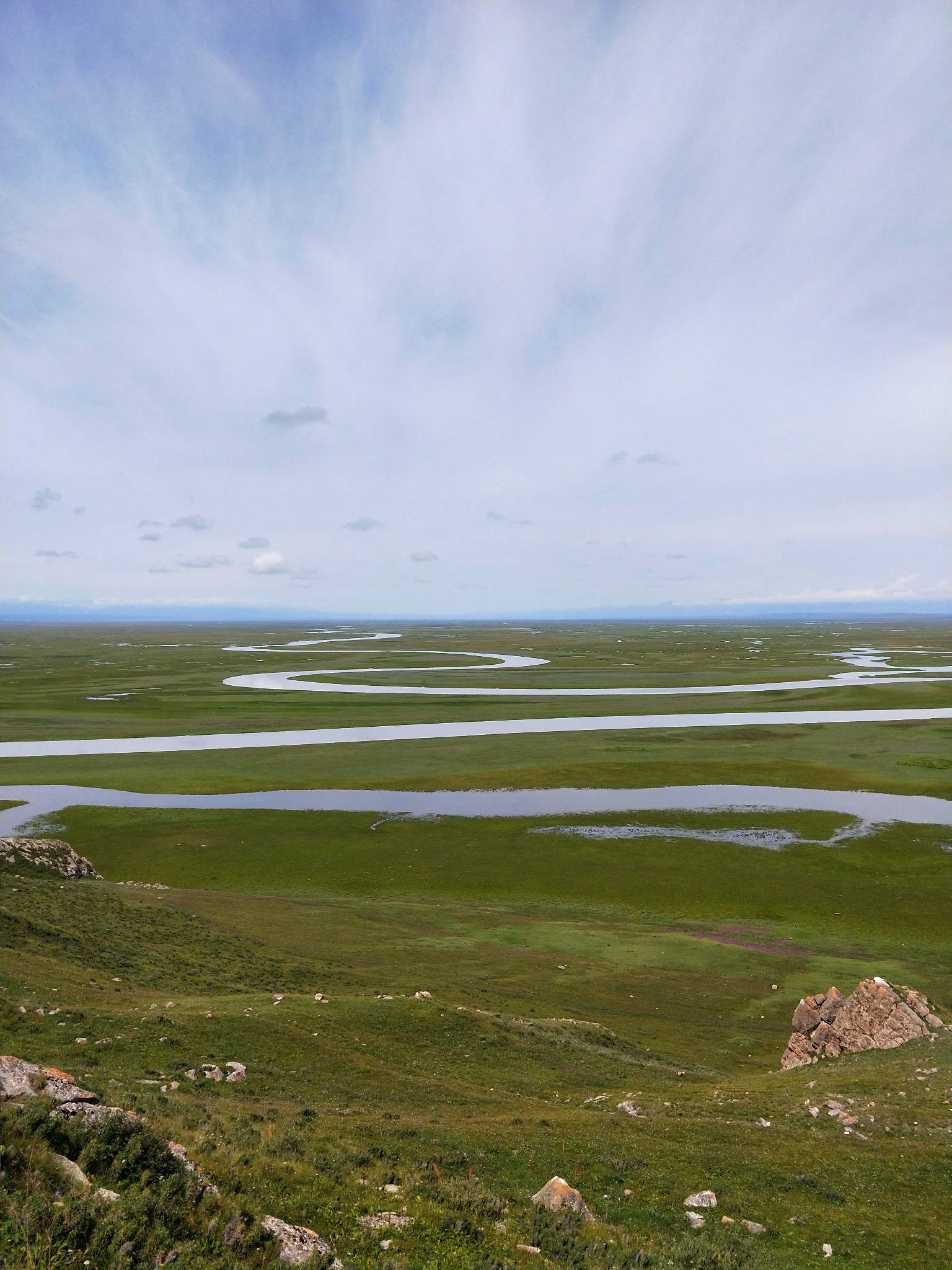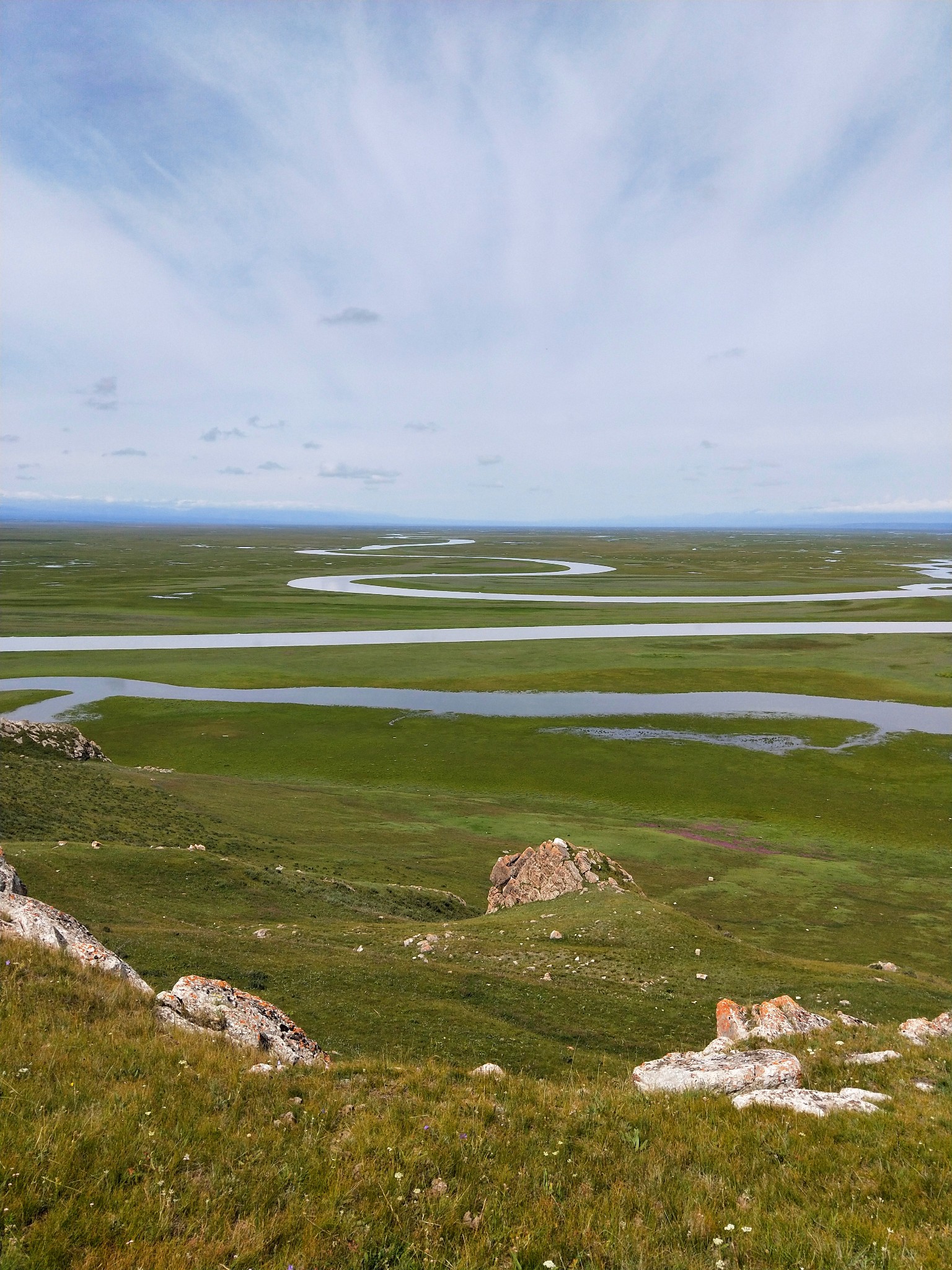 在巴西里克山观景台向西看,开都河从遥远的天边缓缓而来,千折百曲,如同玉带舞动于大地,美丽、壮观