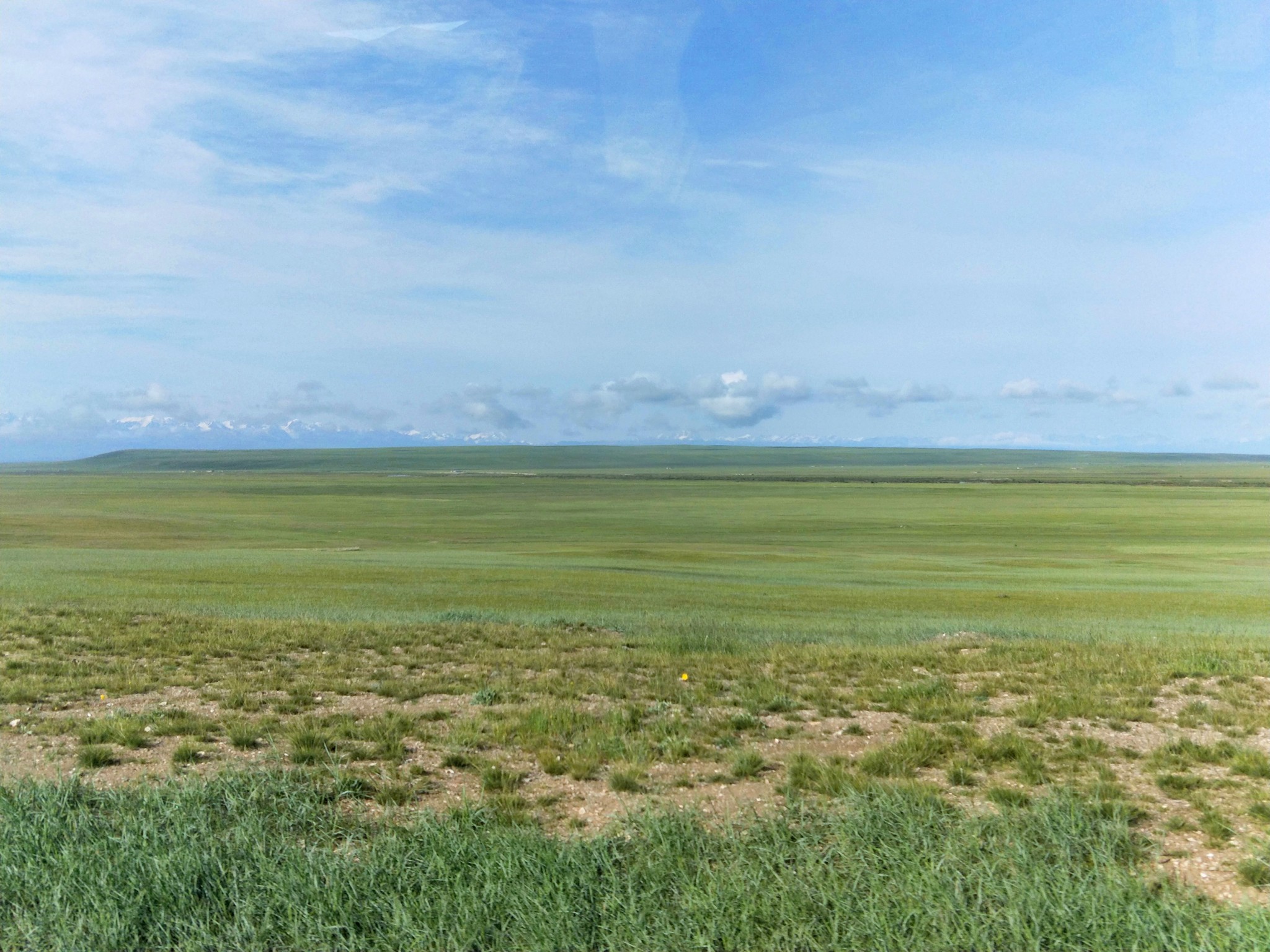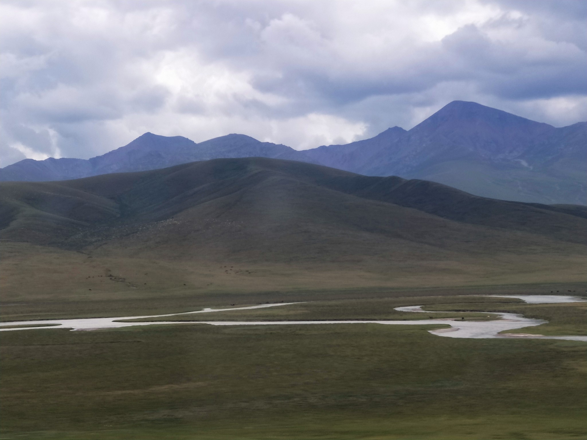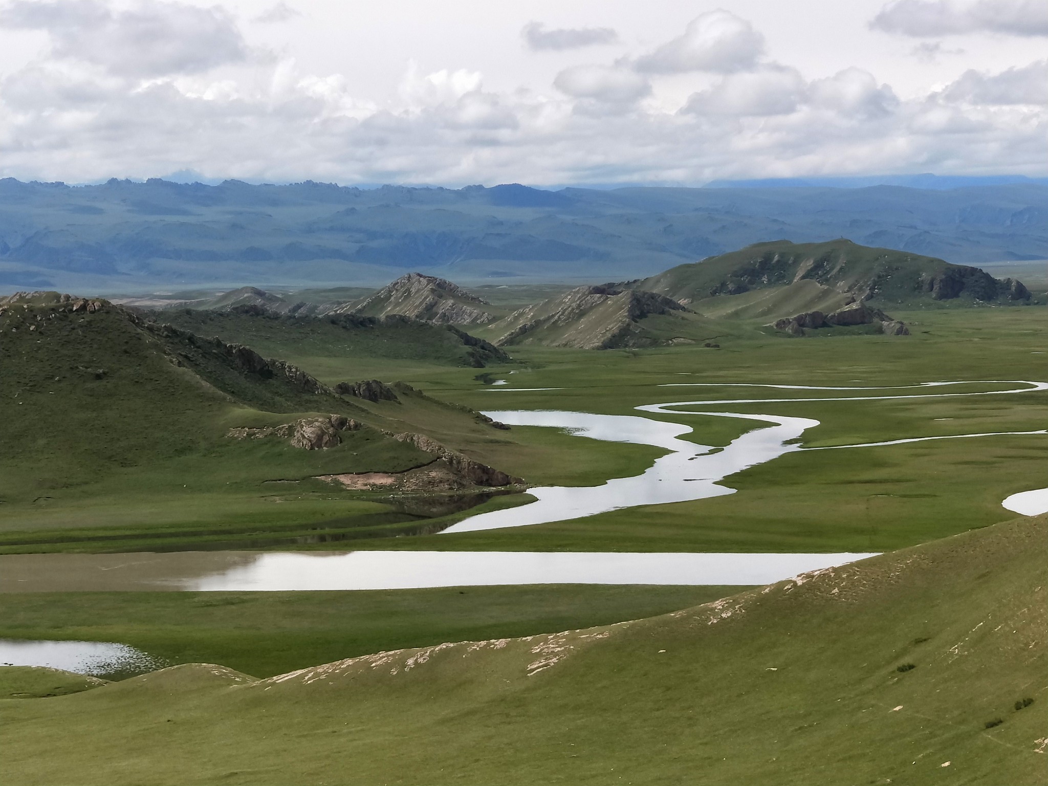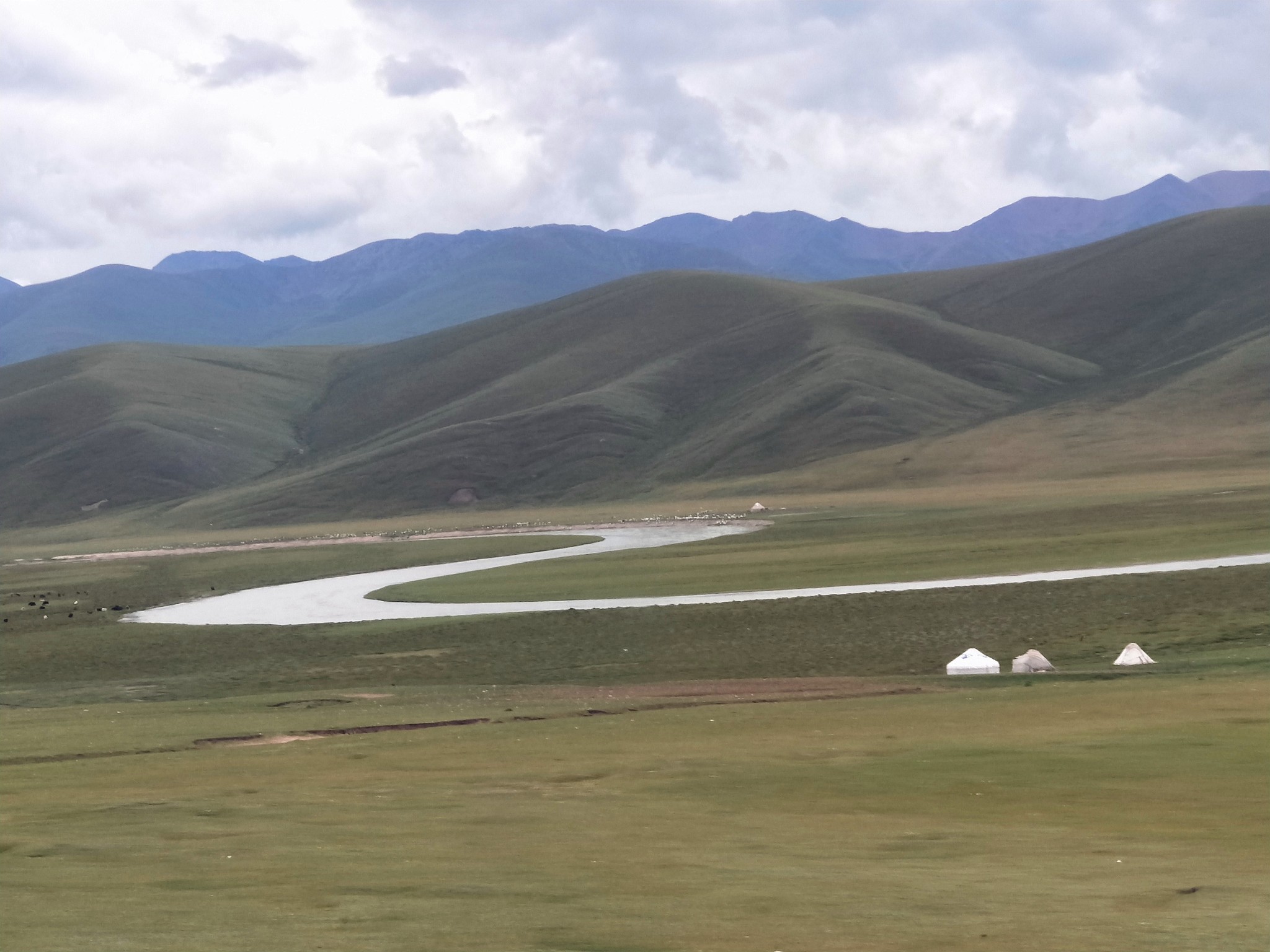 在巴西里克山观景台向西看,开都河从遥远的天边缓缓而来,千折百曲,如同玉带舞动于大地,美丽、壮观