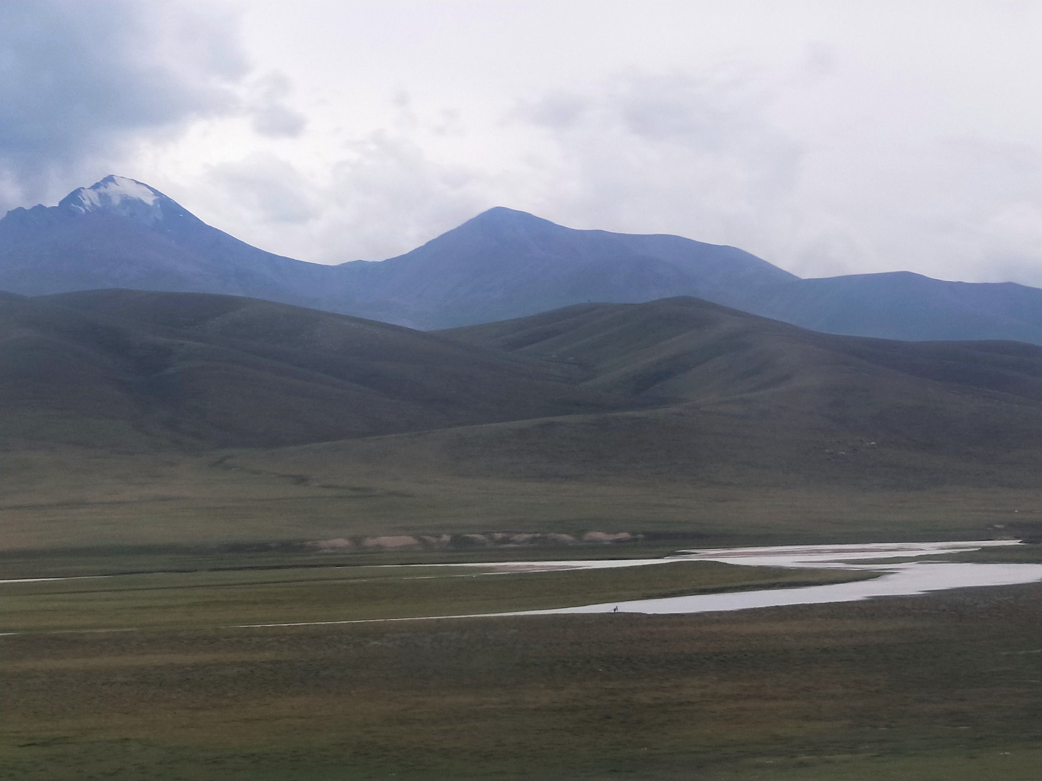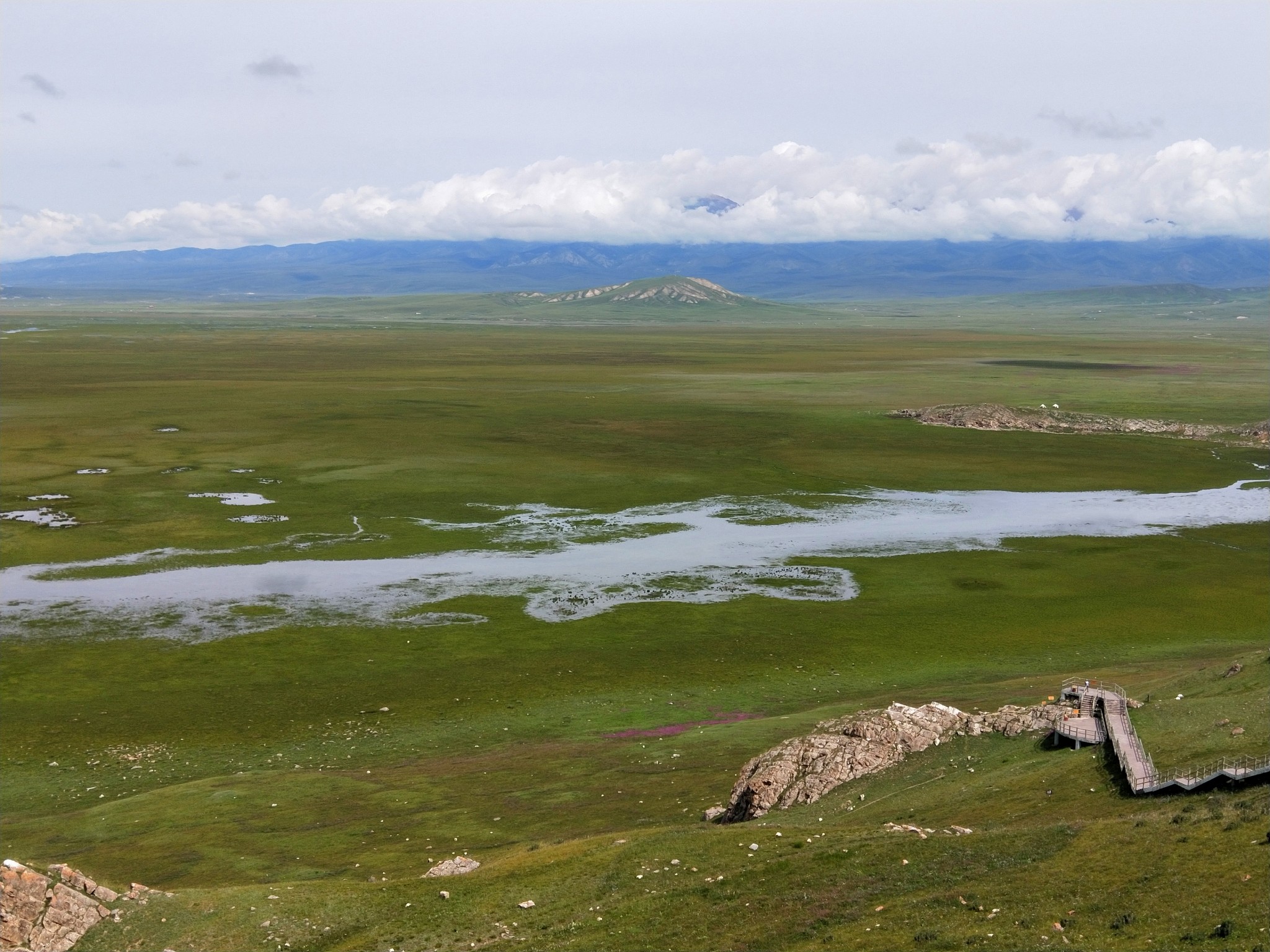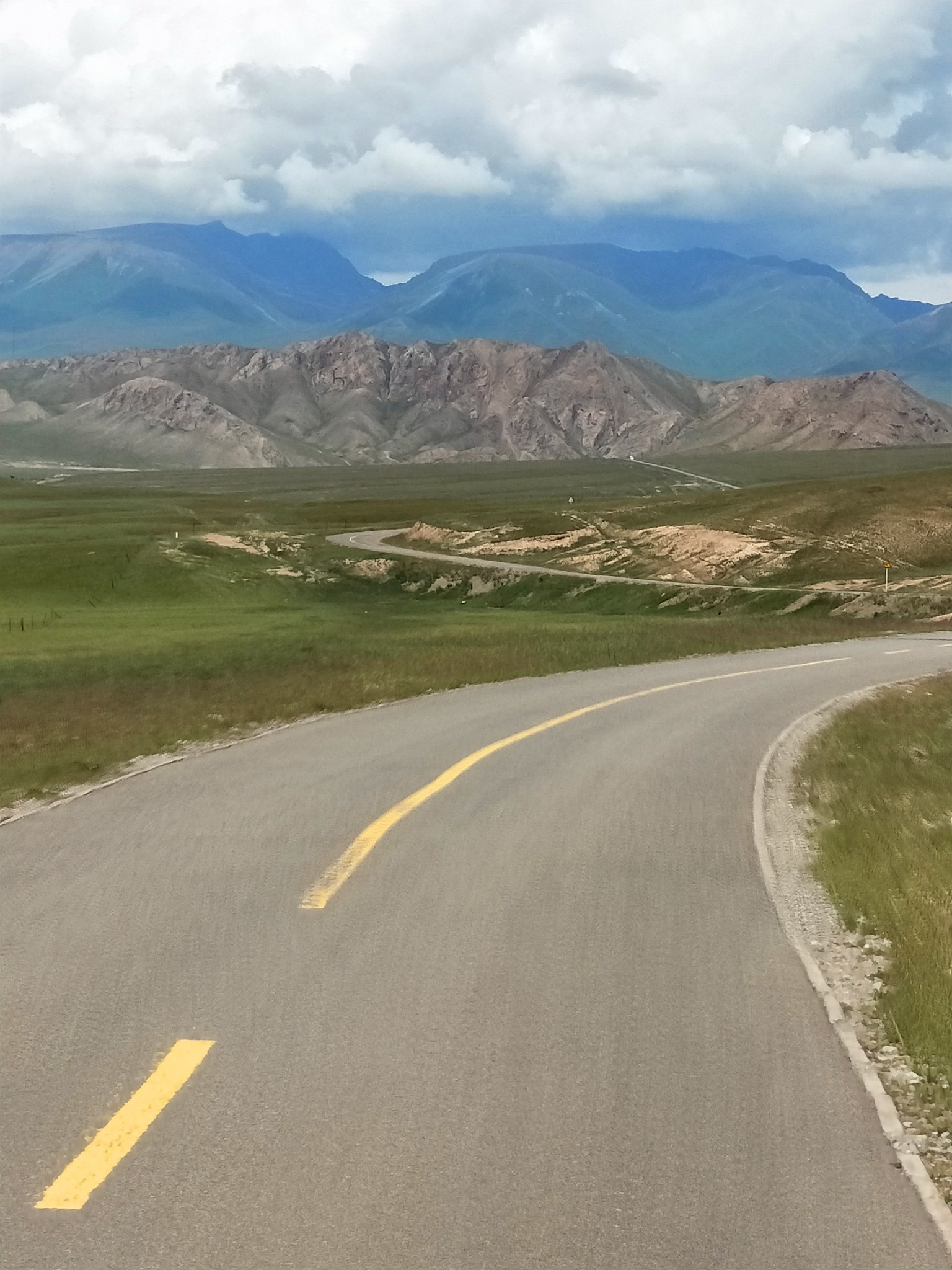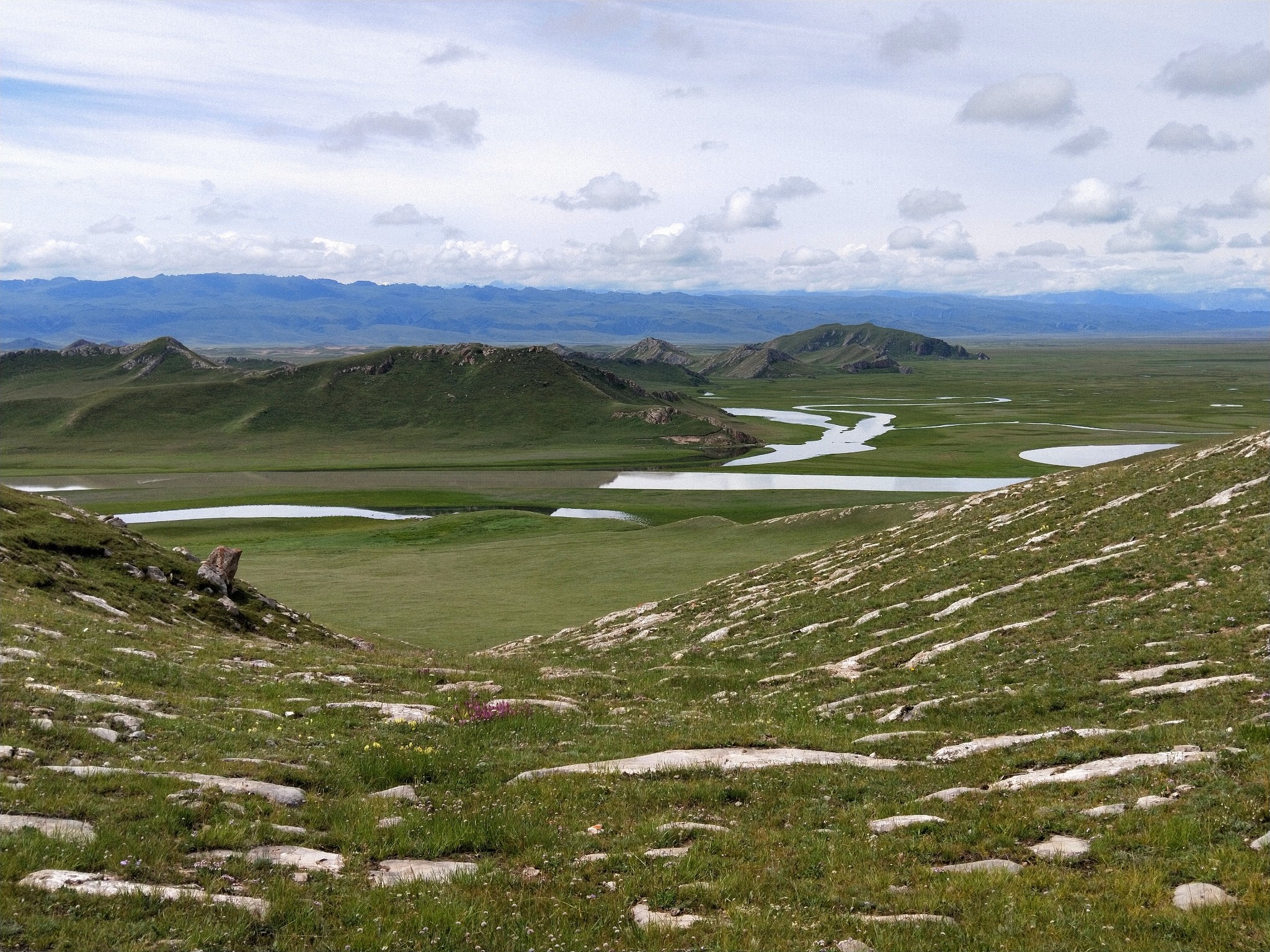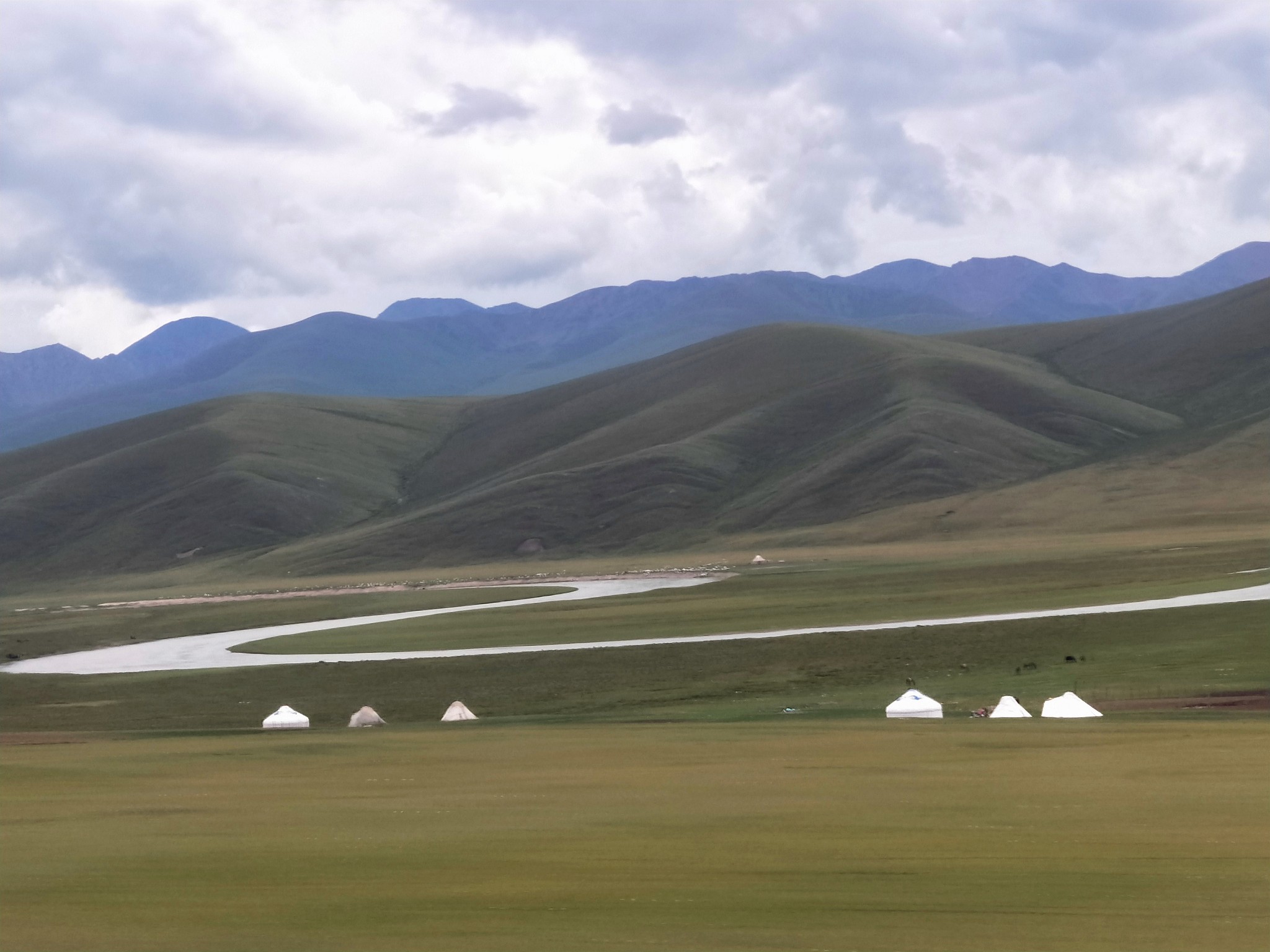 在巴西里克山观景台向西看,开都河从遥远的天边缓缓而来,千折百曲,如同玉带舞动于大地,美丽、壮观