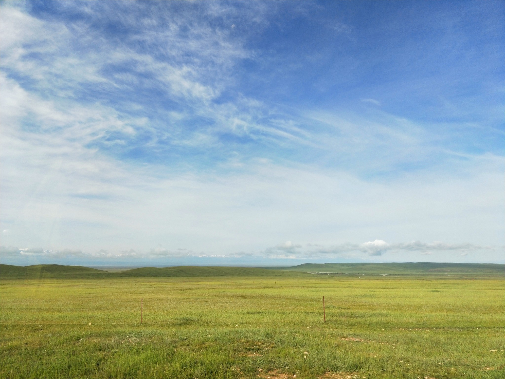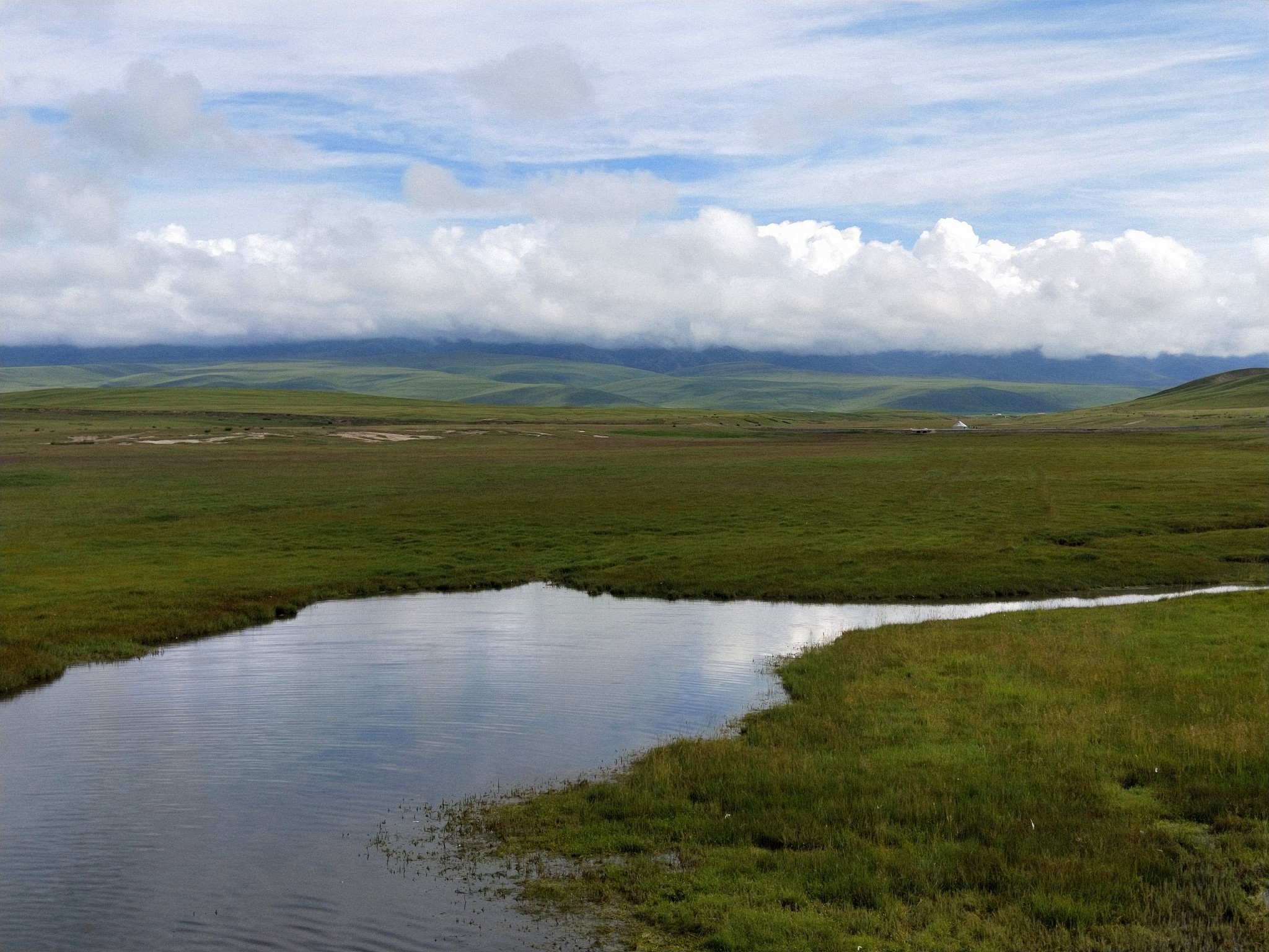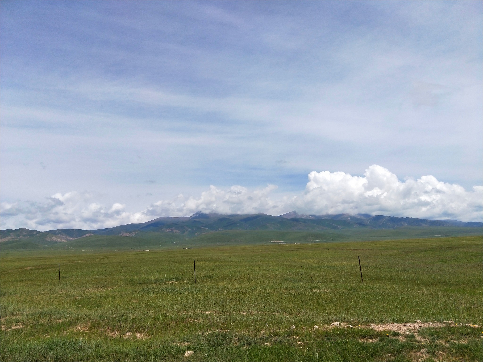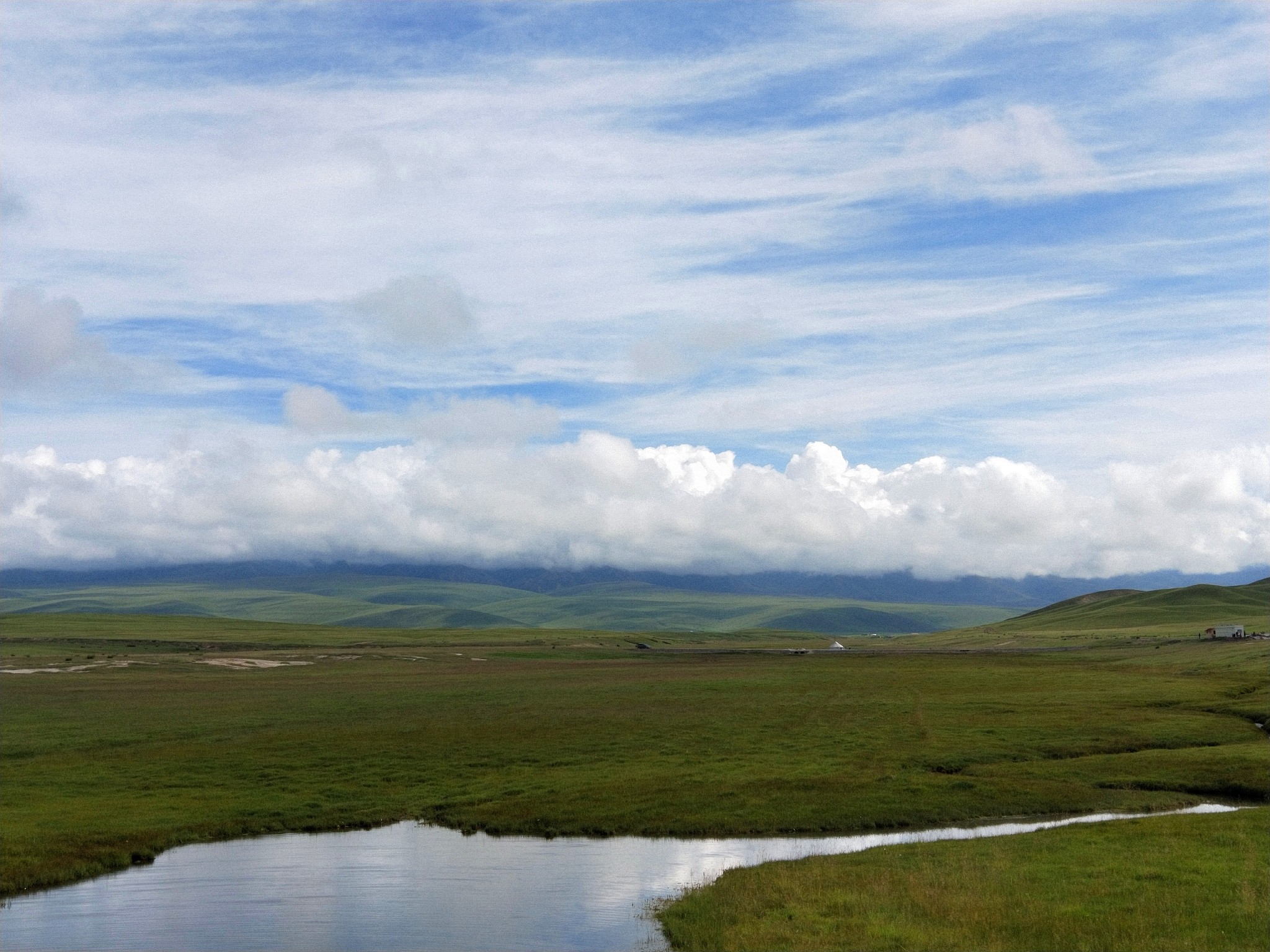 蓝天白云下的远山,大草原,蒙古包,一派牧歌悠远的景象
