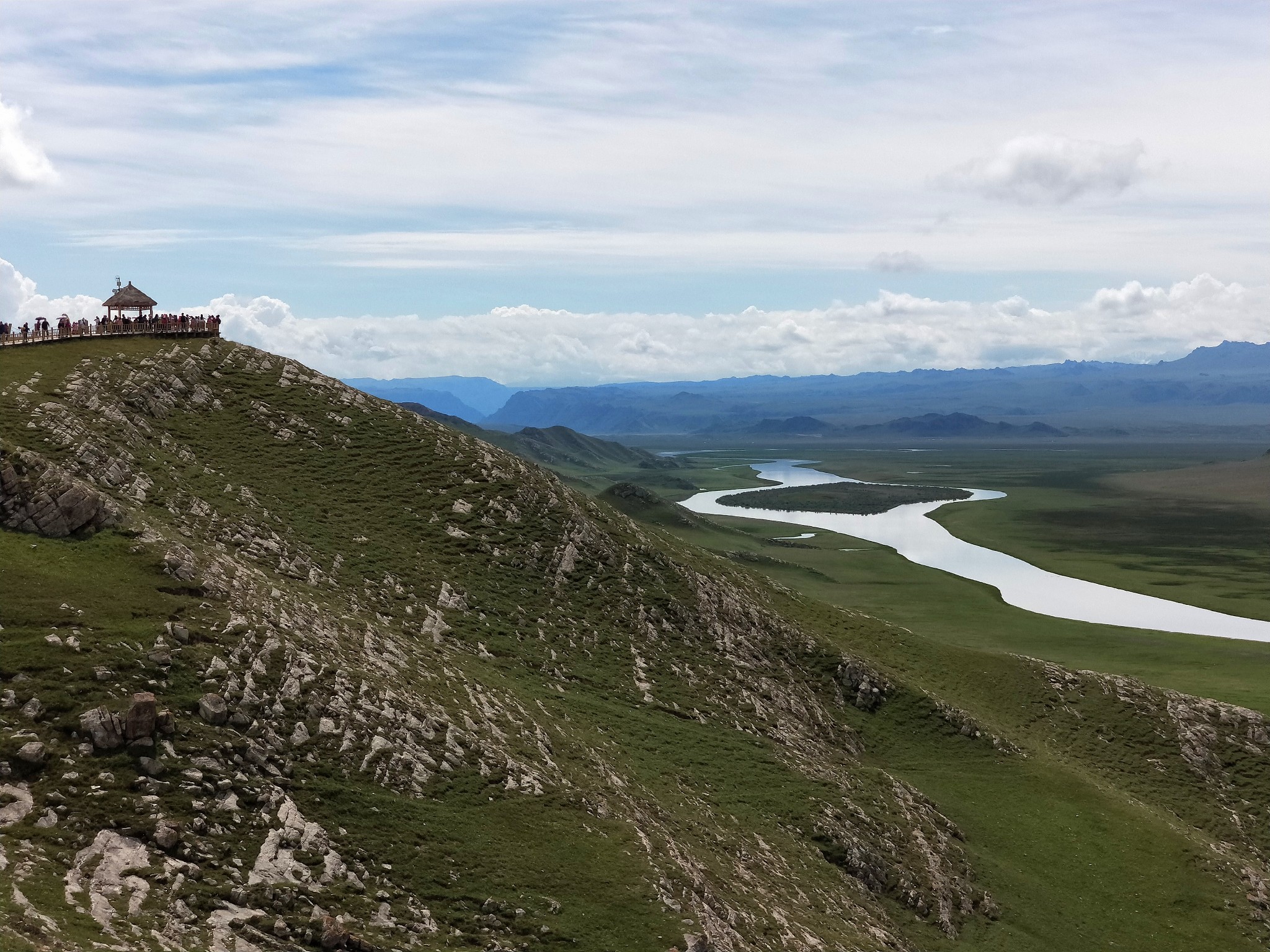 九曲十八弯是开都河在草原上缓缓流淌形成的一个自然景观。在山坡上设置了一个观景台,下观光车后花20元乘坐电瓶车或步行20分抵达观景台