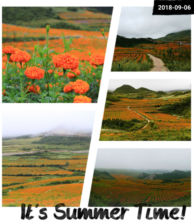 在去往韭菜坪的路上,好多成片的万寿菊花海,此季正是收获的季节,乡亲们都忙碌着采摘万寿菊。
