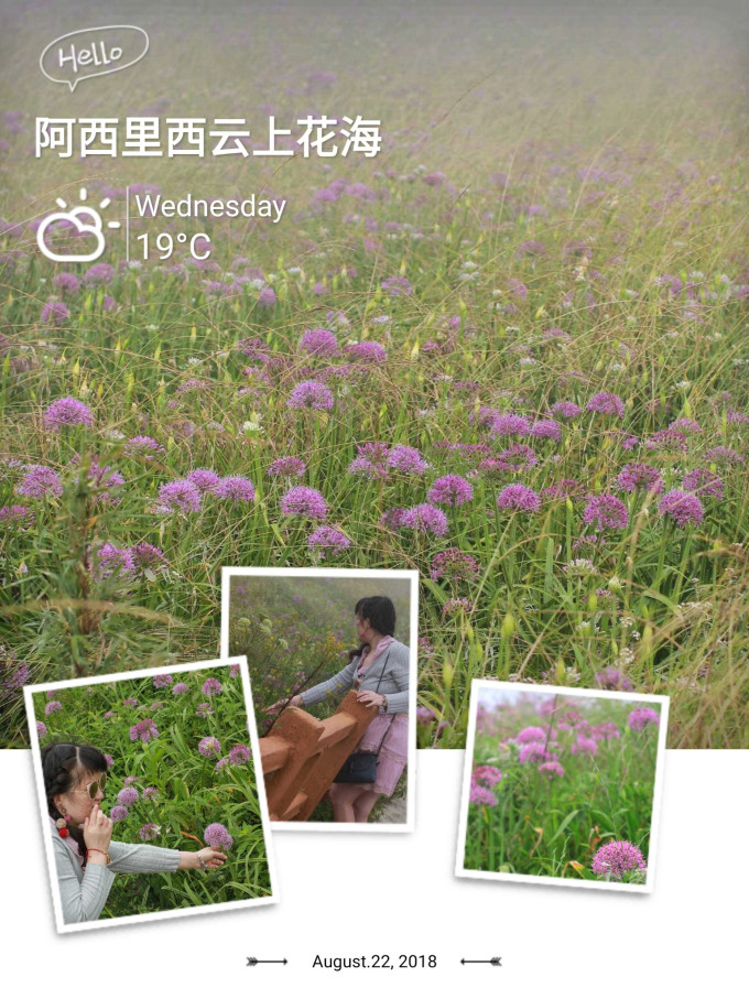 我们选择了环保车上山,一路上吹着凉爽的清风,望着翠绿的山峰。到了山上沿着木梯拾阶而上,不时看到零星的韭菜花。而到了山顶,那大片的韭菜花海映入眼帘,栈道两边满是紫色的花海。云雾之间花海朦胧若隐,难怪称作“云上花海”,真是名符其实。