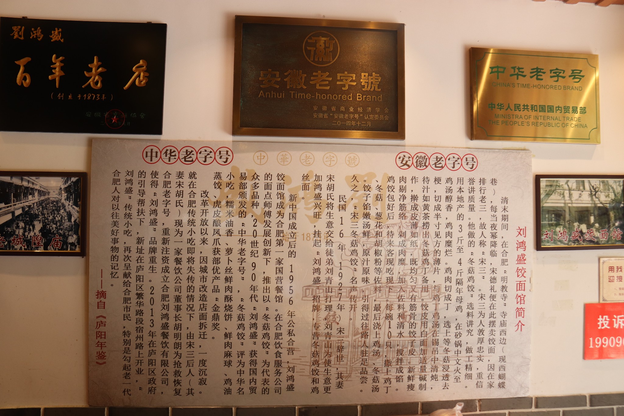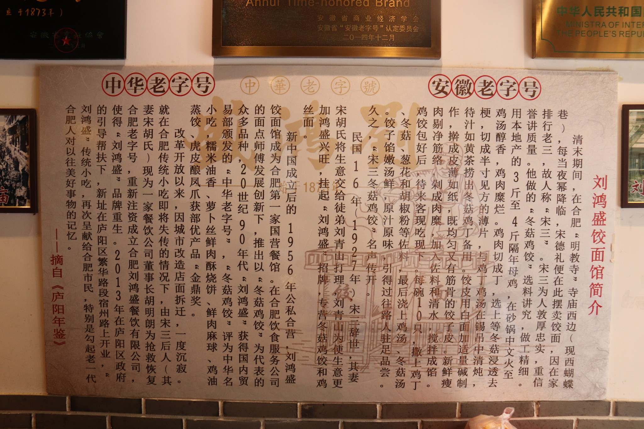 刘鸿盛起源于清代末年庐州城内一位名叫宋德礼的年轻人创立的。这位宋德礼别号宋三,当时从1873年开始,他每天晚上都会挑着饺子到东大街(淮河路步行街)一带销售。"这种由香菇、鸡汤、鸡肉和鲜肉馄饨制成的冬菇鸡饺是刘鸿盛起家的招牌小吃,现在是中华名小吃。宋德礼非常注重选料,讲究质量,专用本地产3斤重以上的隔年母鸡与冬菇一起制作饺子。"冬菇鸡饺因其饺皮薄如纸,馅嫩汤鲜,深受合肥人的喜爱。宋德礼和妻子宋胡氏仅生有一女,嫁给徒弟刘青山。1927年,宋德礼的女婿刘青山接手经营,后打出了"刘鸿盛"的招牌,在后大街(安庆路)开立店铺。此后几十年里,刘鸿盛饺面馆长盛不衰,成为合肥人有口皆碑的餐饮老字号。1956年公私合营,收归国有。我家长辈也曾经是这家店的常客。2000年代初因为旧城改造等原因曾陷入绝境,幸得宋德礼妻子宋胡氏娘家后代胡明朗收购,找回旧日老员工老厨师,恢复老手艺,重振百年老店。现在刘鸿盛是中华老字号。而现在的老板胡明朗是合肥餐饮协会副会长。刘鸿盛现在已在合肥开立了十几家门店。