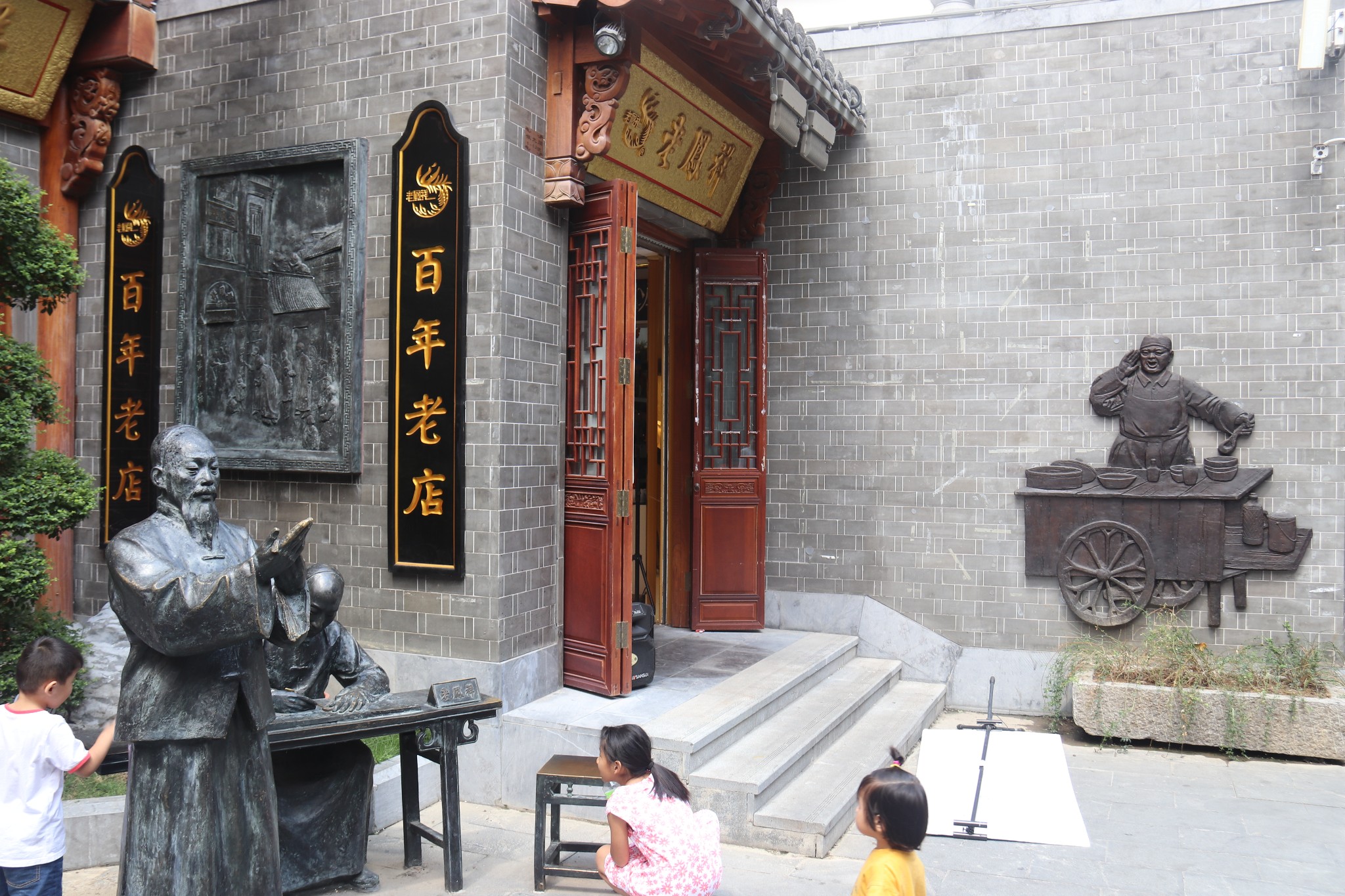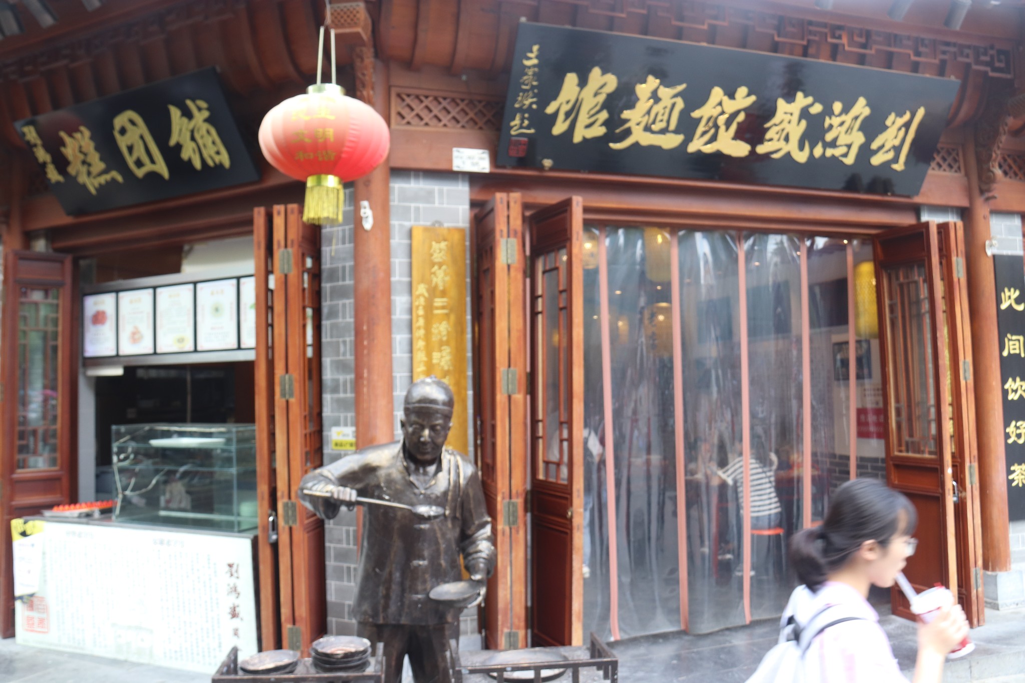刘鸿盛门口还建了刘鸿盛创始人宋德礼挑馄饨担卖馄饨的雕塑。清末民初是中国的一个乱世,百姓生活极端贫困,大部分人平时连冬菇鸡饺这样的食物也吃不起。宋德礼每日晚间在明教寺旁摆摊叫卖,虽然出售的食物美味可口,价格公道,受到人们欢迎,也备尝艰辛,但想必所得也仅是糊口有余,从摆摊到开店还是用了几十年勤俭节约的奋斗。晚清民国时代的生意人都要受到官府衙役、地痞流氓、兵匪强盗、不法警察的欺压,这些地痞无赖经常白吃白喝,反抗者则遭辱骂、殴打。当时的宋德礼想必也只能经常忍气吞声。相比之下,现代的社会、政府、治安、法规制度、商业环境、物质生活水平已经比当时提高了太多。每个人个人和家庭的人幸福都离不开安定的国家局面和稳定的社会环境。