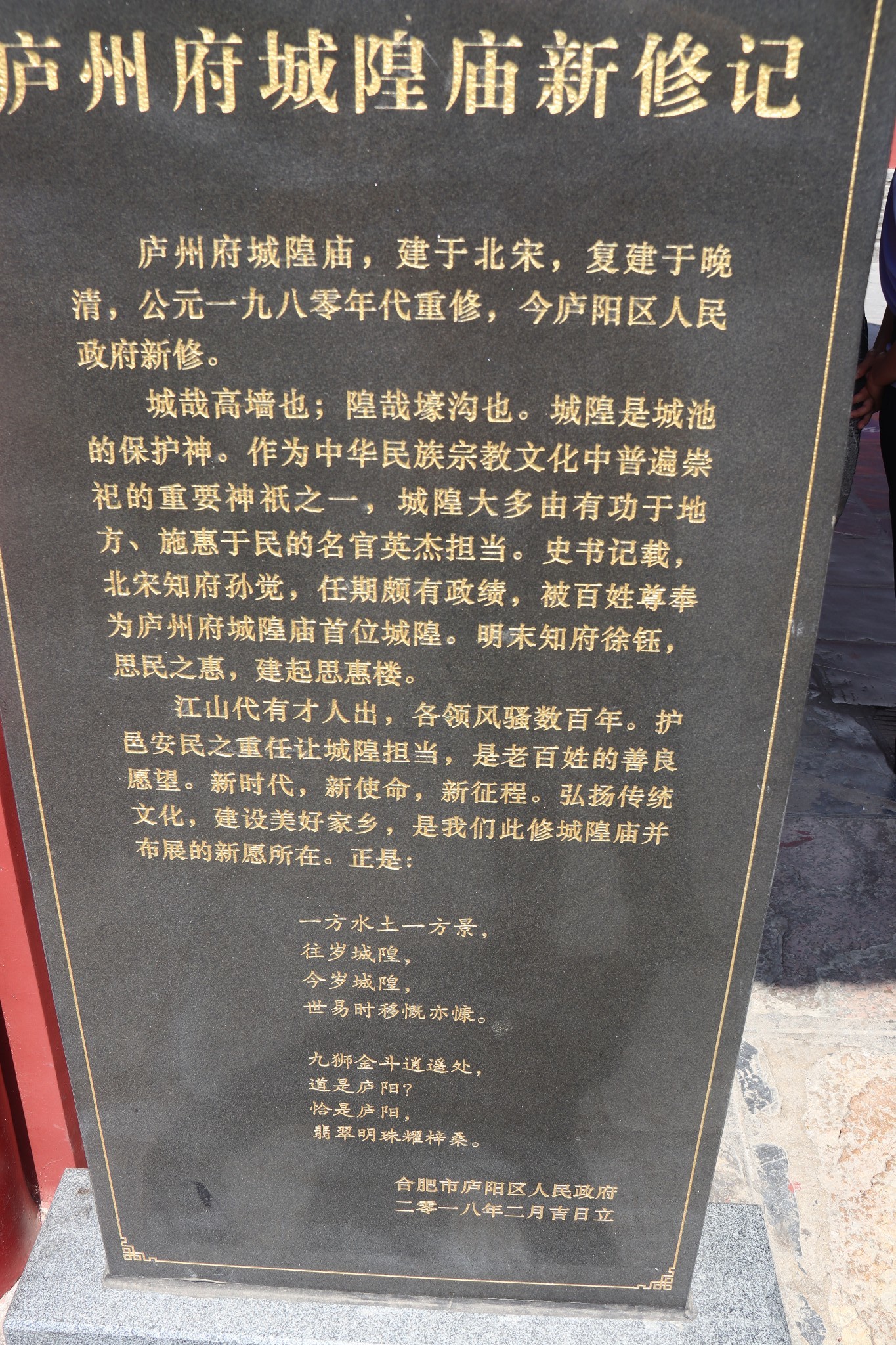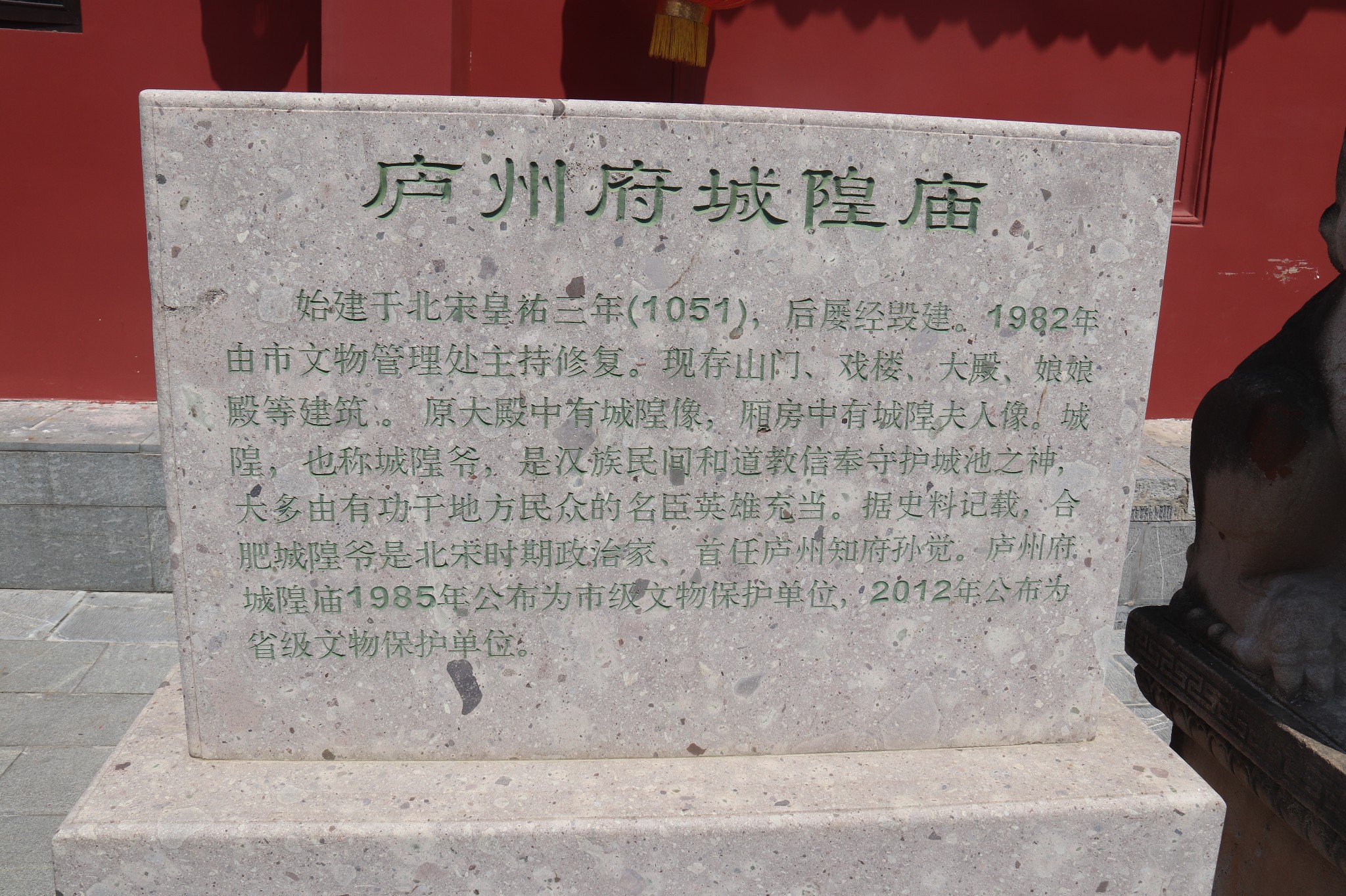 合肥现任的城隍老爷名叫孙觉,是北宋神宗年代的一位庐州知州。碑上的介绍有错误孙觉不是庐州知府,只是知州(宋代只有都城、陪都和皇帝当过知州的州才设府)。孙觉也并非第一任城隍,虽然第一任庐州城隍姓名现在无法确知,但孙觉是北宋神宗时期担任庐州知州,比建庙的时间要晚二十多年,宋代人也不会为在世的人建立生祠,因此庐州府城隍庙第一任城隍老爷另有其人。