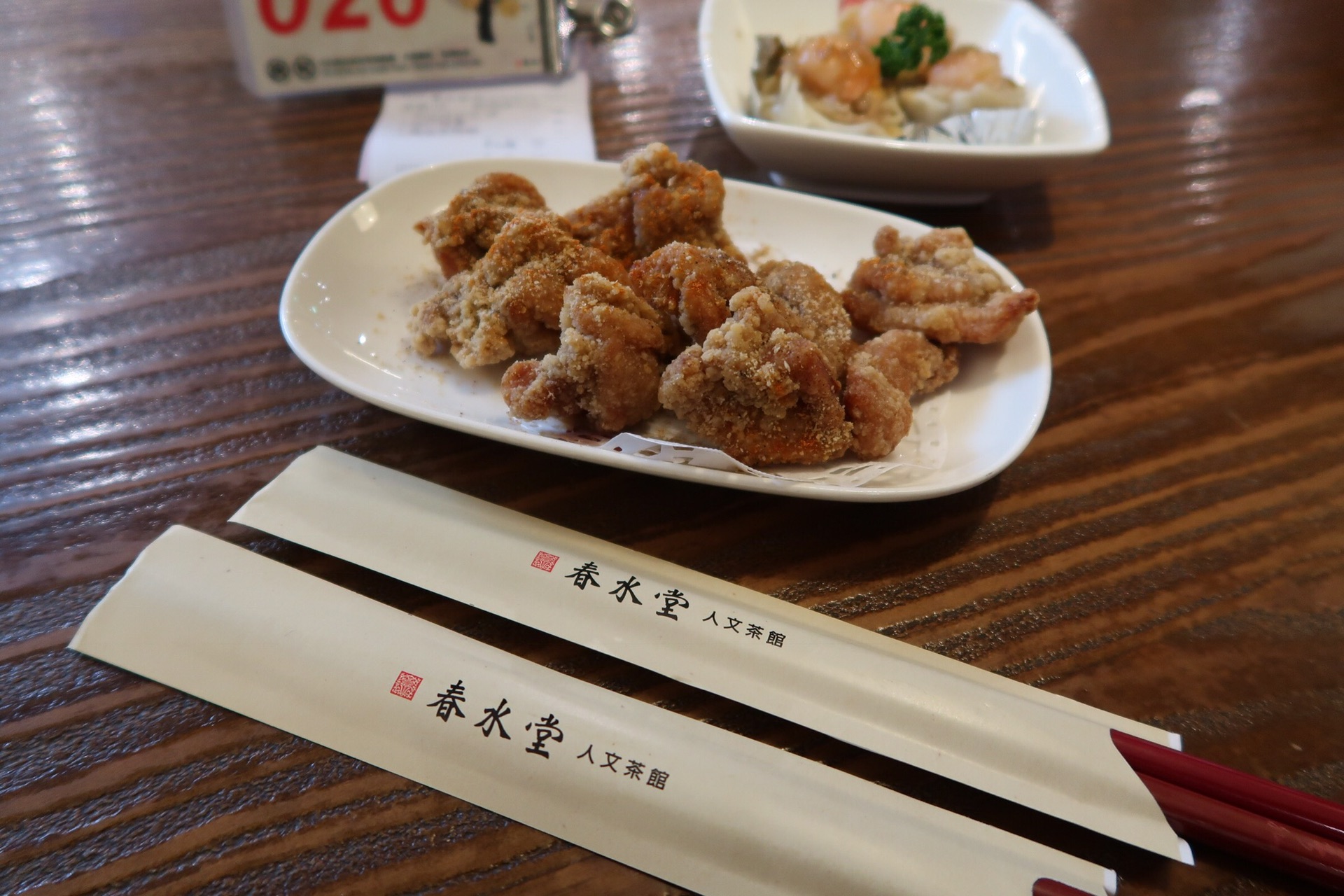 我们点了一份盐酥鸡/一份虾仁烧麦/一杯中杯的珍珠奶茶(热的据说口感更好)点单的时候店员小姐姐说点中杯的奶茶堂食和外带都有85折优惠~