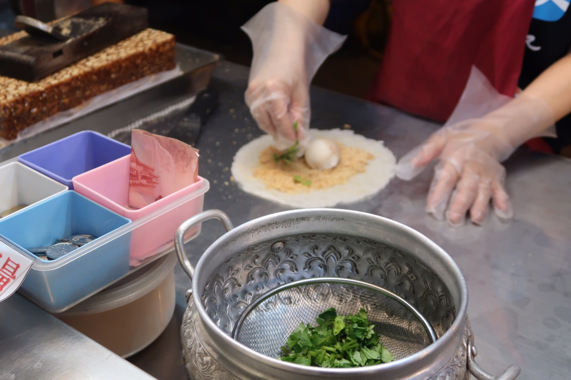 香芋冰淇淋球上面撒些甜花生碎(还可加香菜)在裹上一层饼皮/冰凉香甜的口感瞬间抚平了天气带来的燥热~