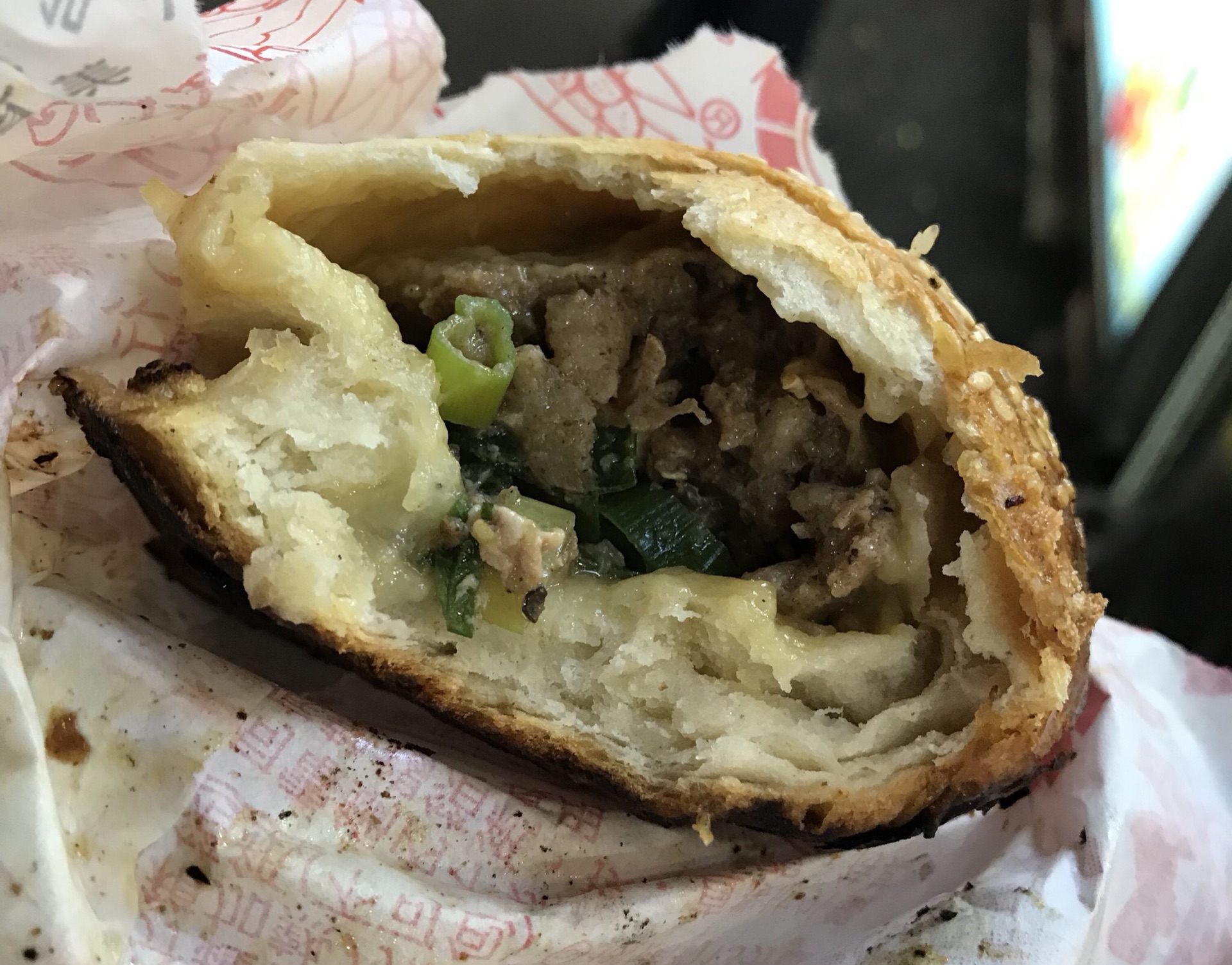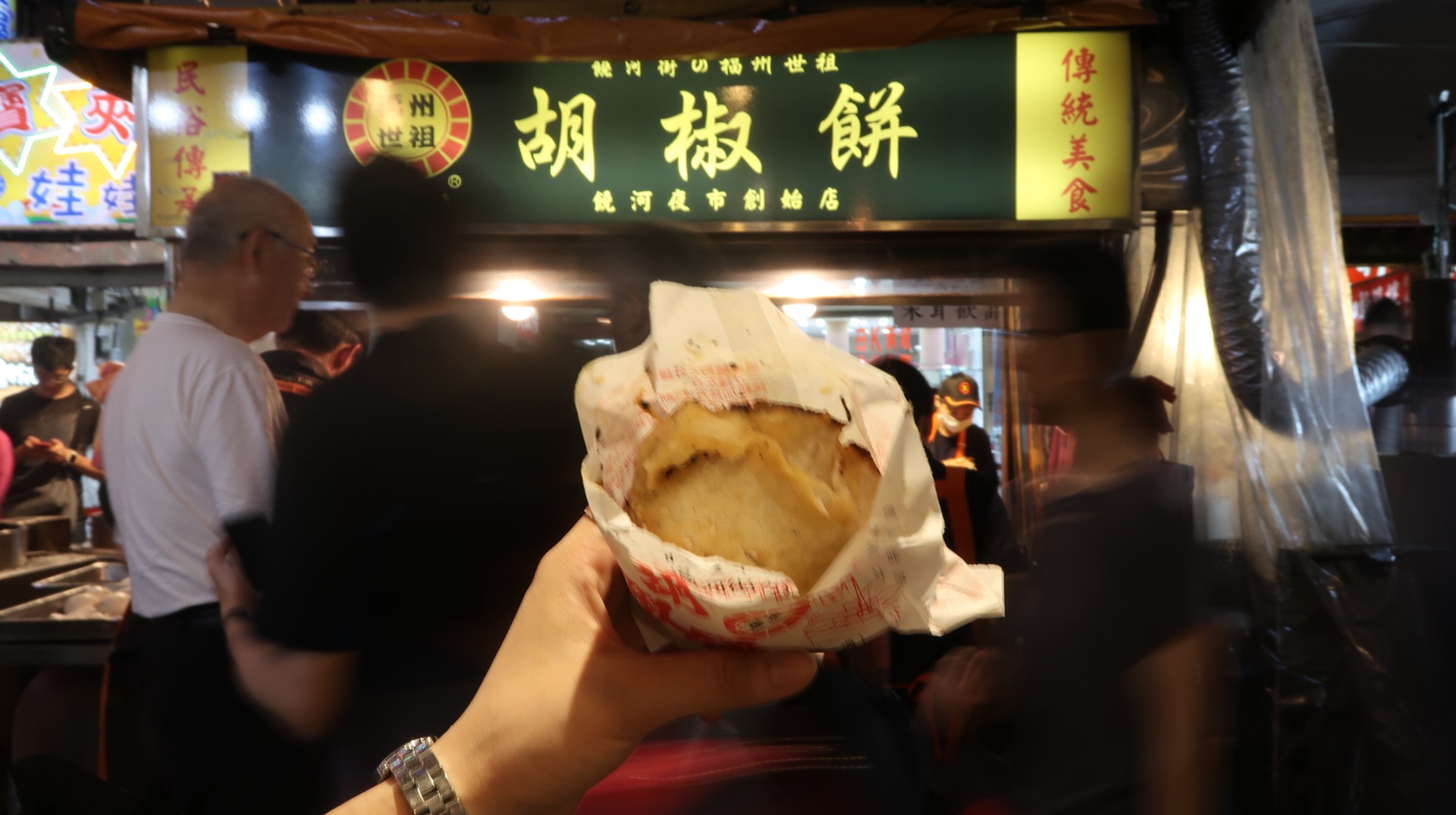 胡椒饼:一进夜市就看到超多人在排队/这家店的位置超好啊.就在夜市正中心.一眼就能看到~一个有馒头那么大/外皮酥酥脆脆.内馅也很实在/最后离开夜市前买了杯芭乐汁~