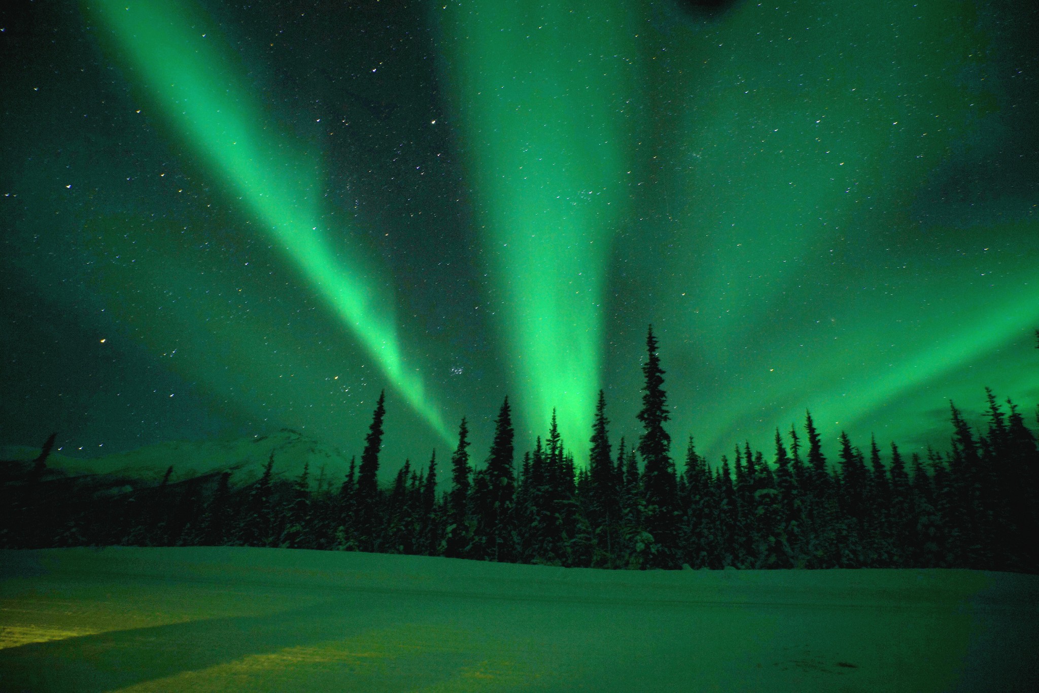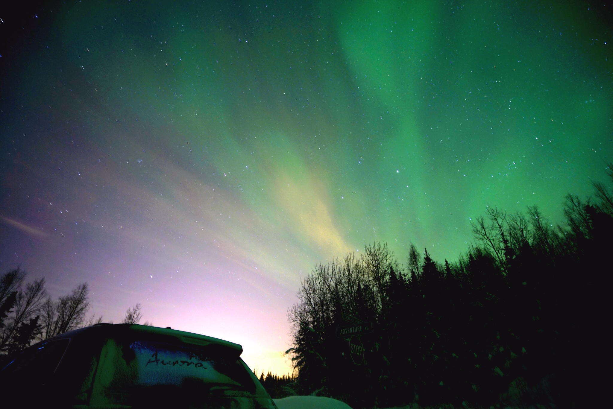 在费尔班克斯,观测极光的最佳时间是每年3月,我们出去看了三晚,命中了两次。首先要确认当晚的极光指数:http://auroraforecast.gi.alaska.edu/,一般三级就能看到,四级五级已经挺爆发了。在极光指数前有个大前提,就是天气状况一定要好,一定要晴朗,如果多云的天气,极光指数再高也看不到。我们没有看到的那晚极光指数有5,但是厚厚的云层愣是把他遮了个严实。每天晚上的最佳观测时间在凌晨十二点到两点之间,不用特意选择特殊的地点,开出城到没有光源的路边,架起相机也能拍出美美的照片。在北极圈内的话,yukon和wiseman周围的公路都是很好的观测点。如果在公路边观测的话一定要注意安全,停在指定的停车点。之前看了一个攻略推荐Murphy Dome,在费尔班克斯郊区的山上,其实并不太好,首先上山的路很恐怖,超黑超窄,到山顶要开半个多小时,另外dome是有光源的,所以观测并不理想。如果极光指数高,天气又好的话,在安克雷奇的郊区同样能看到,在google map中搜索eagle river view point,开车上山能得到完美无遮蔽夜景,没有极光看看星星也是很美的。拍极光的话必须带三脚架,攻略自己网上找吧~
