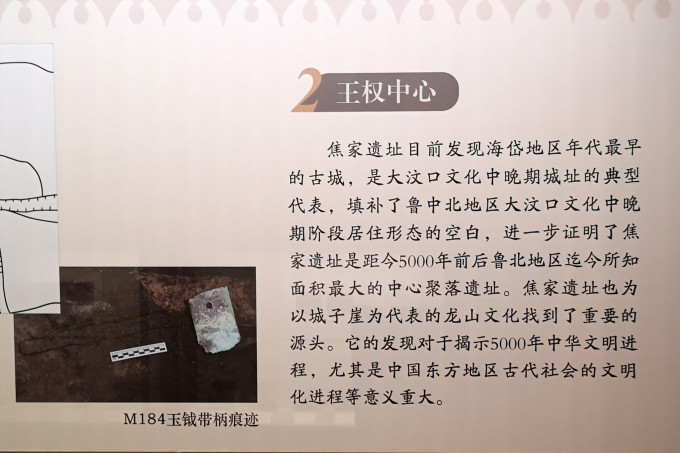 “横空出世”,展示焦家遗址的发现和基本概况;“王者之城”,展示遗址从大型聚落到中心城邑的演变历程;“礼制先河”,表现墓葬中折射出的社会分化、等级差别和礼仪制度;“工艺流变”,旨在展示焦家先民高超的制陶、冶玉工艺发展。