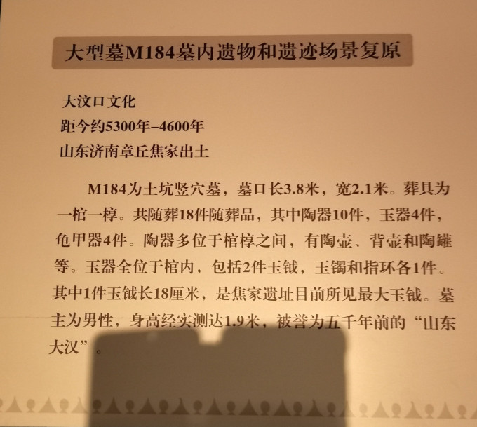 最重要的一个展品是M184墓葬遗址复原,展示了身高1.9米、被誉为五千年前“山东大汉”的墓主人遗骸。