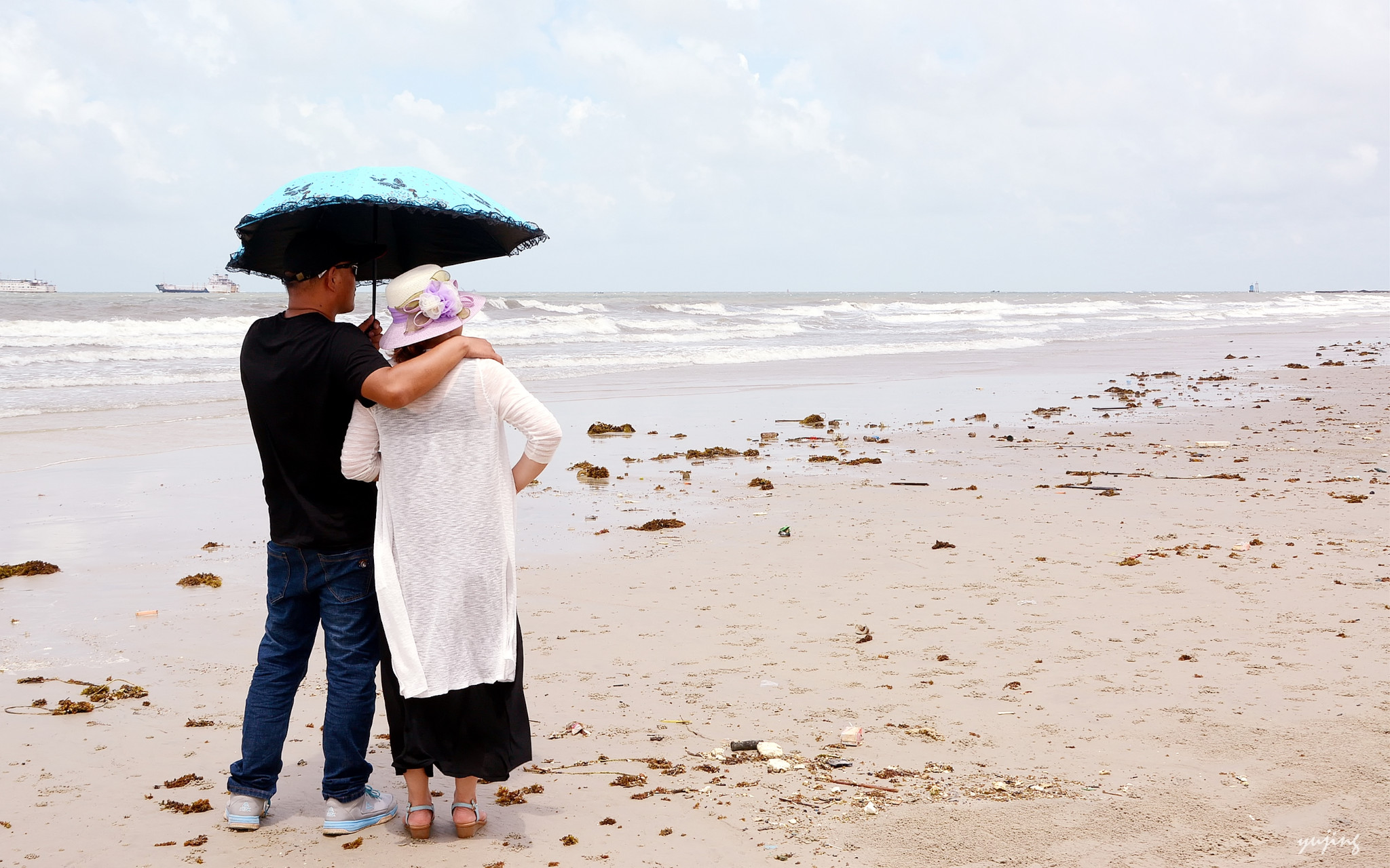 少来夫妻老来伴,相携牵手游银滩。