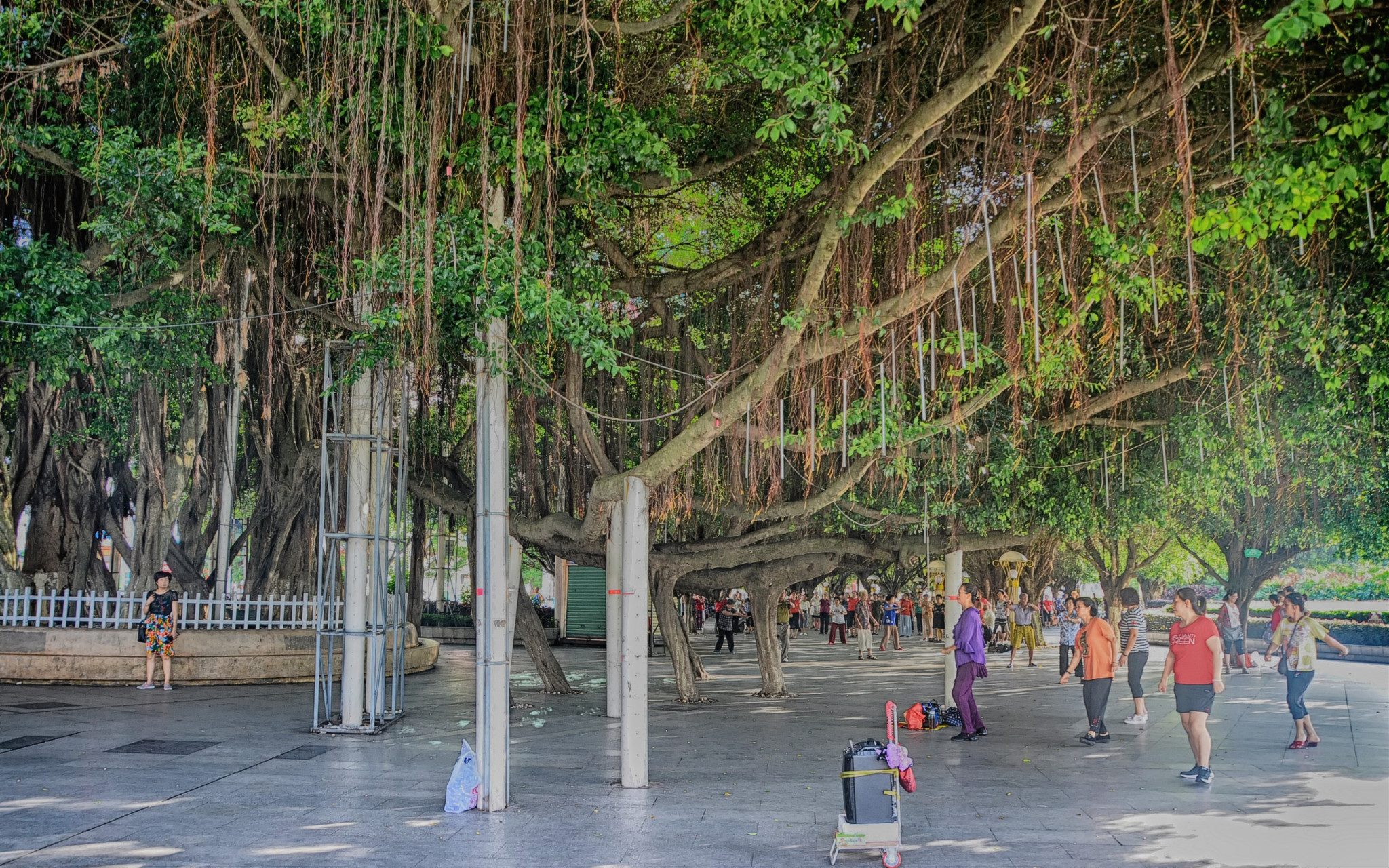 集会广场区的绿化以高大宽叶乔木盆架子为主要树种。这种树富有亚热带特色。树干光滑朴实。树形优美,呈叠层塔形,犹如一把遮天蔽日的大伞,形成整洁和谐的休闲活动环境。