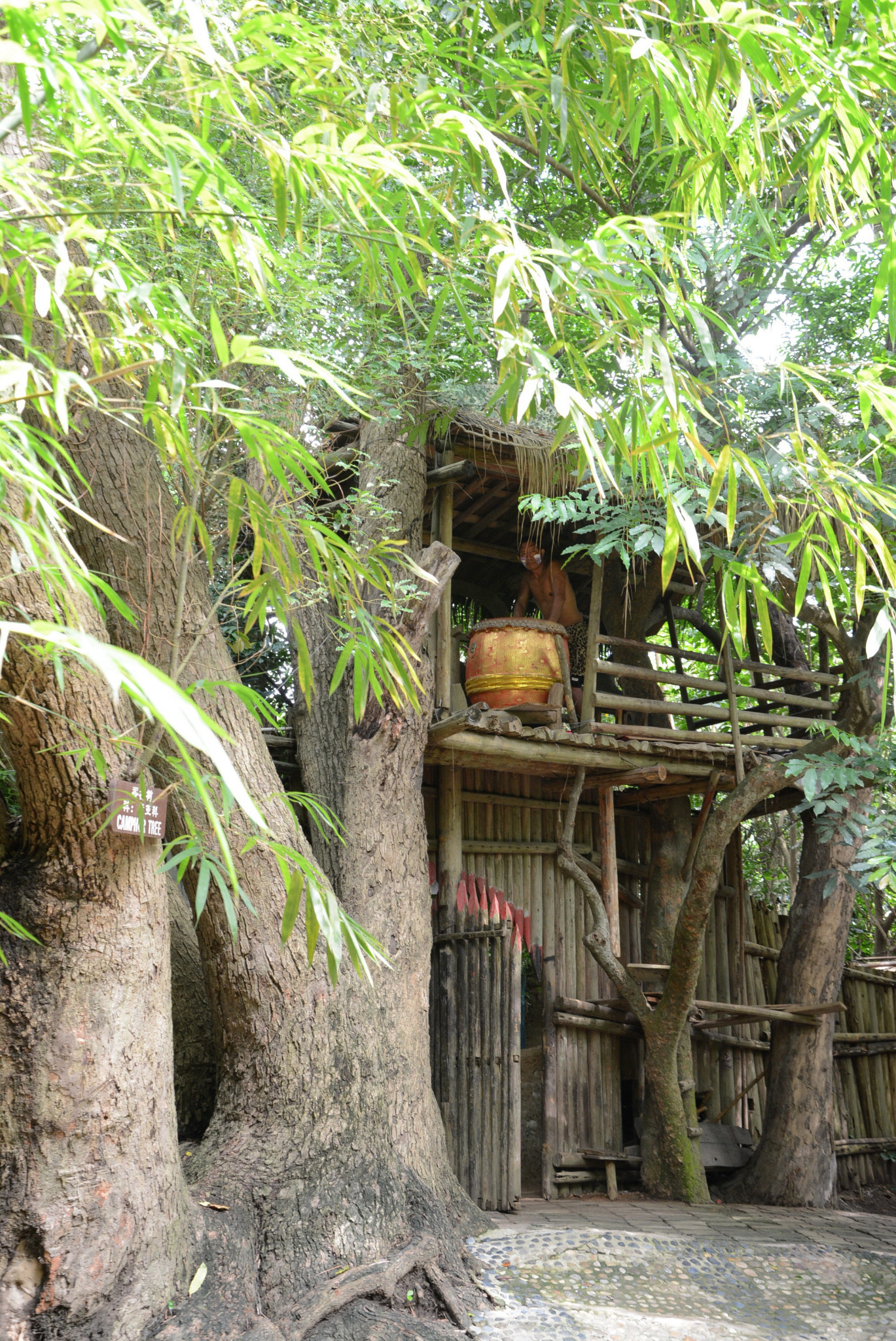 进园后突闻一阵低沉的鼓声。抬头望去,声音来自在树上生活的土人(是真是假?)。