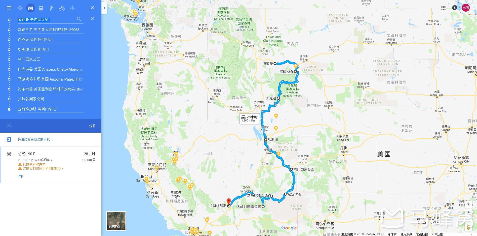3、从黄石一路往南开,我参考大量的游记,选择了本次的路线,具体见图: