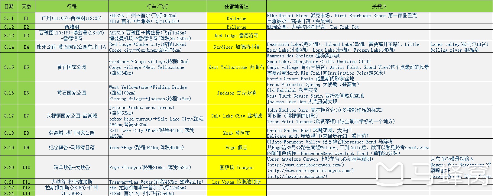 心心念念多年的黄石国家公园之旅,今年3月就请好了8月的年假,4月第一周就出机票,第二周用了3个晚上就把酒店和民宿全部搞掂(当然,我早在去年10月就开始写行程,招揽同行的好友),但是依然感觉到8月暑假的旺季,包括上羚羊峡谷的黄金时间预订,居然提早半年定不到最大旅行社的位。但是,当我们入到黄石的时候,发现基本见不到旅行社大巴(平均每日遇上1-2部),玩得还是很舒爽。为感谢我所参考过所有攻略的主人,坚持旅行后回来写攻略,顺便强调一下一些甚少人写的东西,例如从高处看大棱镜泉,熊牙公路,黄石内里的野温泉,精致拱门的徒步情况,大峡谷观星等等。