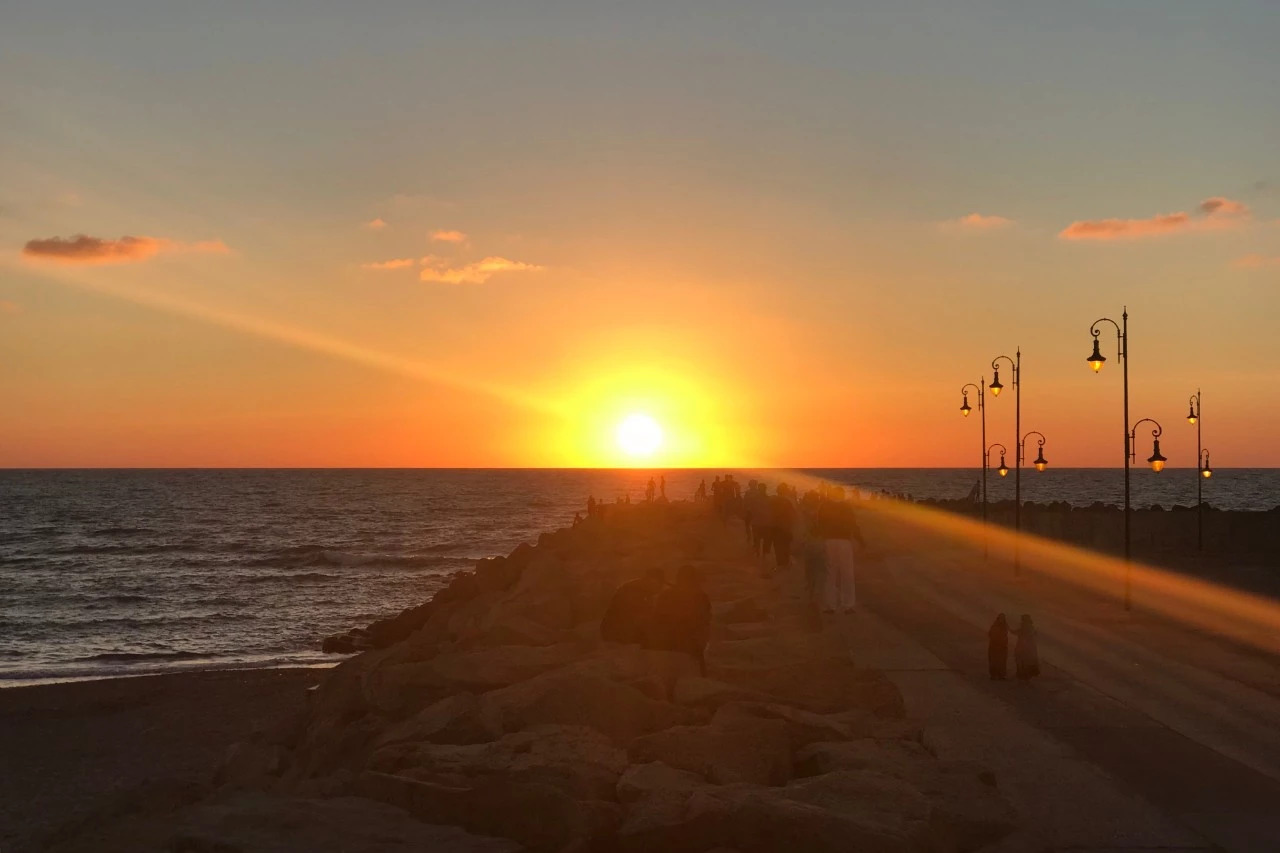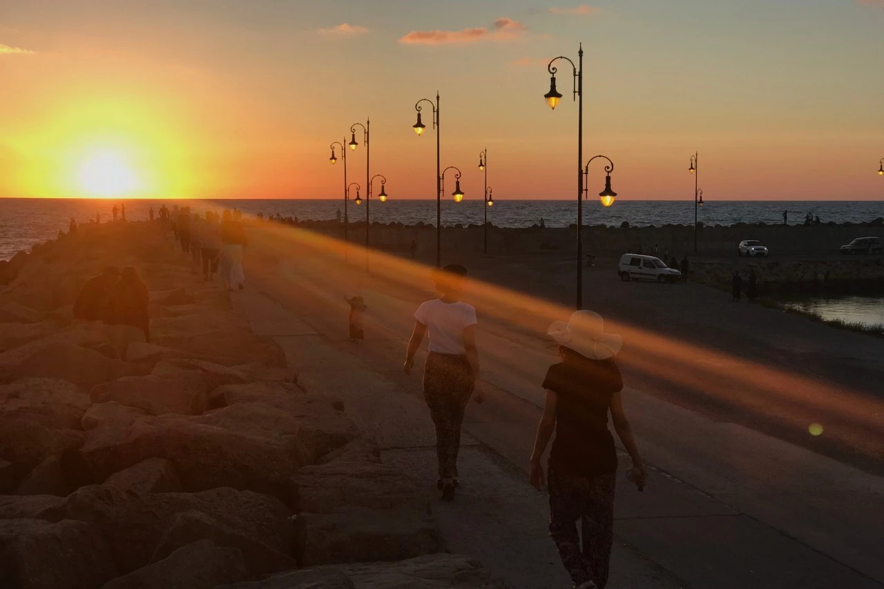 海边防波堤上 三三两两的当地人并肩坐着欣赏日落