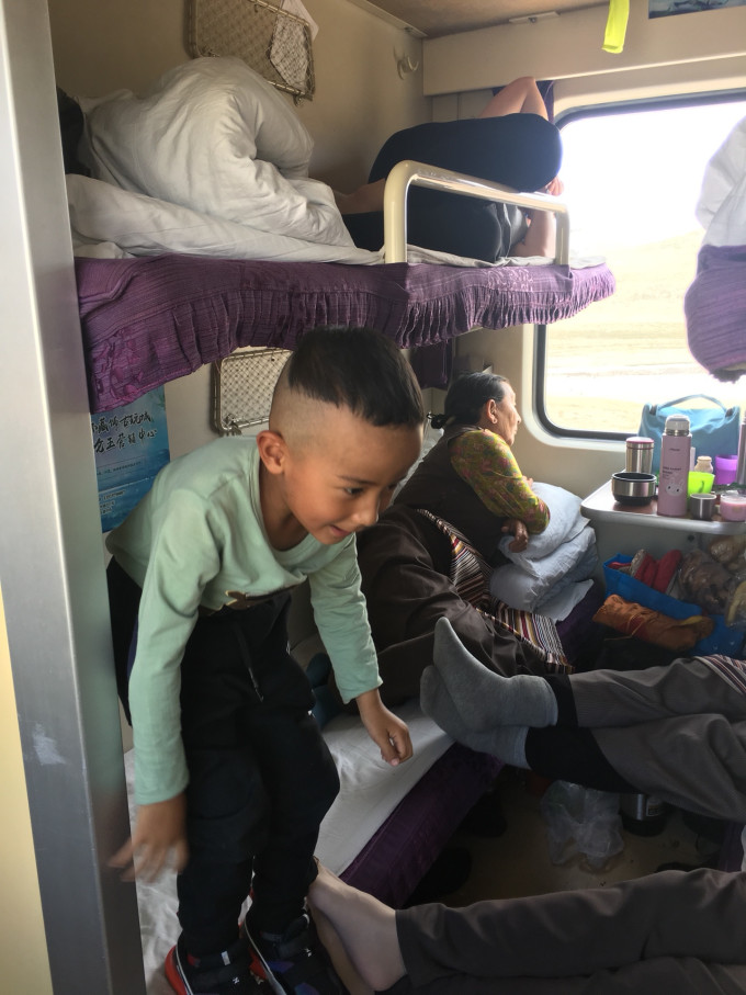 我是下铺,可是全程基本我的床上都坐满了北京的爷爷奶奶,(他们跟团游拉萨回北京),又不好让他们走开,就这样,我一个人几乎在过道的小板凳上坐了一天(下次再也不买下铺了)