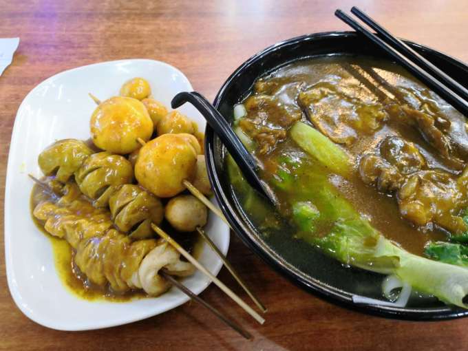 首先听朋友的推荐去了酒店地下的珠海口岸地下购物广场,吃了一家经营了21年的老店,竹苑四海咖喱鱼蛋。鱼蛋不必多说,店家的招牌,必然不会差,可以单点,也可以做鱼丸面,于是我就单点了鱼蛋,要了一碗咖喱牛腩面。咖喱味道很棒,有一点淡淡的辣味,牛腩很入味,也不会很老。几位同事不想和我一样为了吃再走的比较远(我们下午3点才到酒店),看我发的照片,还帮他们代购了一些打包回酒店哈哈。